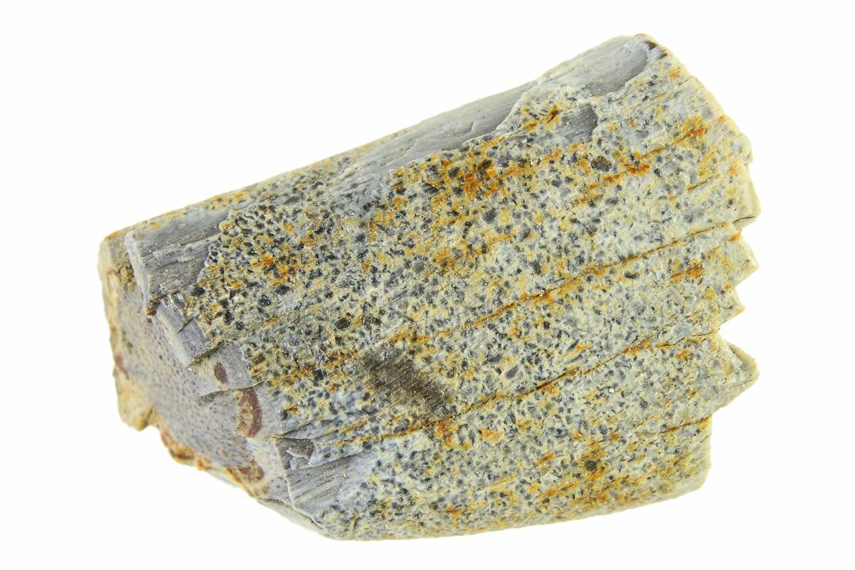 This is a .71" long partial tyrannosaur tooth of the genus Nanotyrannus, collected from the Hell Creek Formation in Wyoming. The enamel of the tooth is heavily weathered and the apical half of the crown is missing.