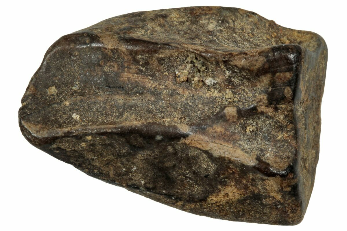 This specimen is one of those naturally shed teeth and features a polished chewing surface, showing clear evidence of the wear that came from processing vegetation millions of years ago.