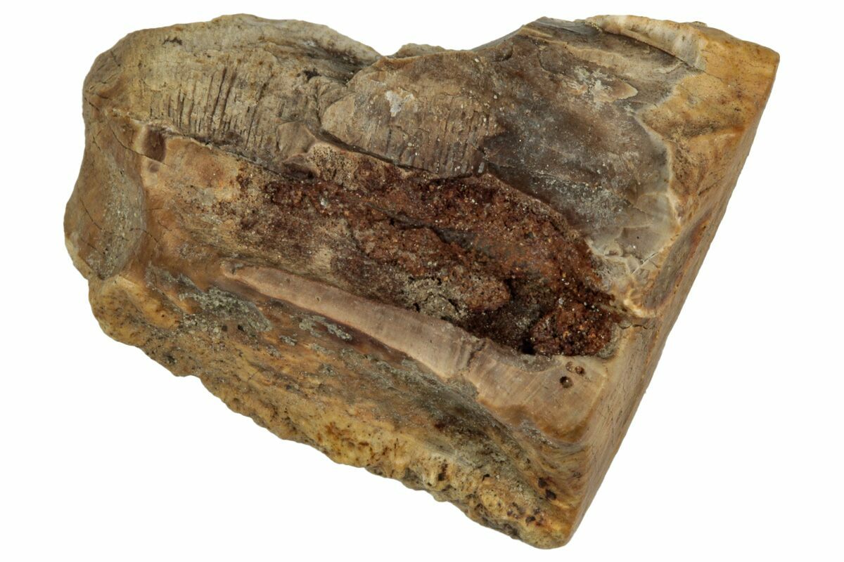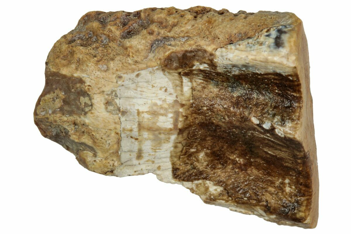 This specimen is one of those naturally shed teeth and features a polished chewing surface, showing clear evidence of the wear that came from processing vegetation millions of years ago.