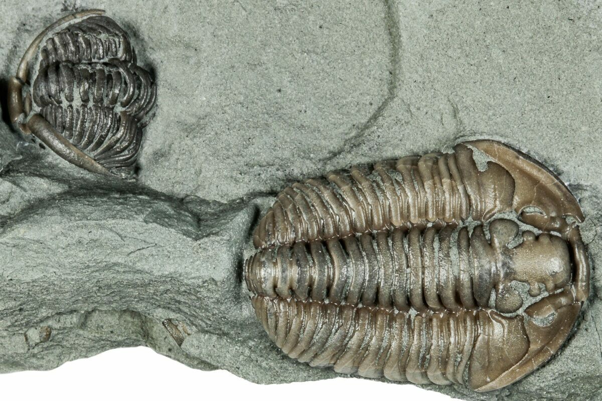 This is a .75" long Flexicalymene retrorsa trilobite from Oldenburg, Indiana. It was prepared under microscope using air abrasives to reveal the beautiful shell detail of this 450 million old trilobite fossil. A second Flexicalymene retrorsa preserved right alongside the prone, though it's enrolled and upside-down within the shale.