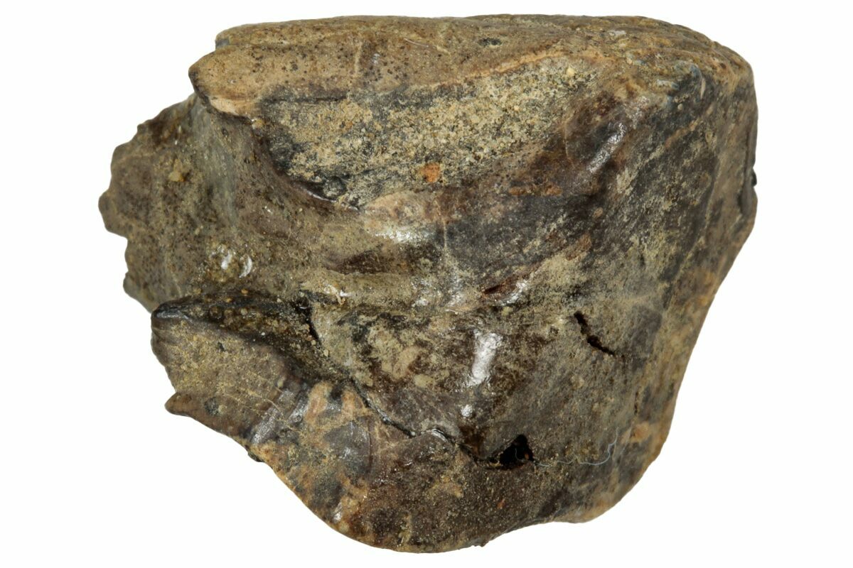This specimen is one of those naturally shed teeth and features a polished chewing surface, showing clear evidence of the wear that came from processing vegetation millions of years ago.