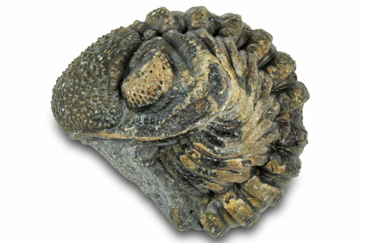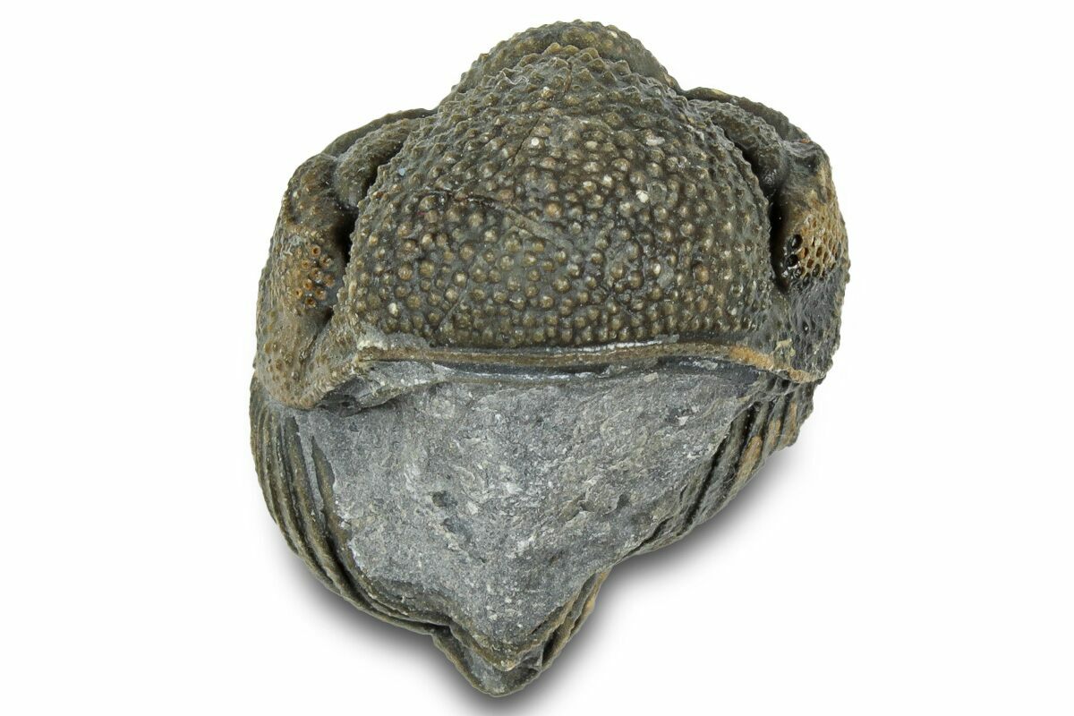 This is an enrolled, .75" wide Morocops trilobite from Morocco. It has a very bumpy shell and visible eye facet detail in both eyes. The tail is missing.