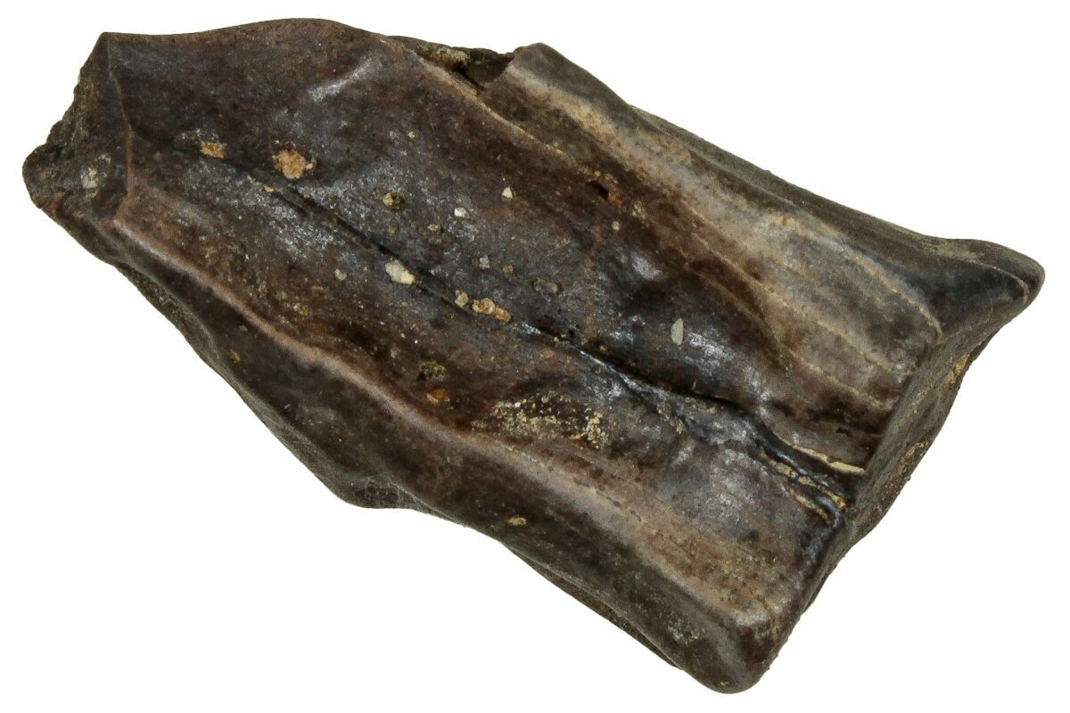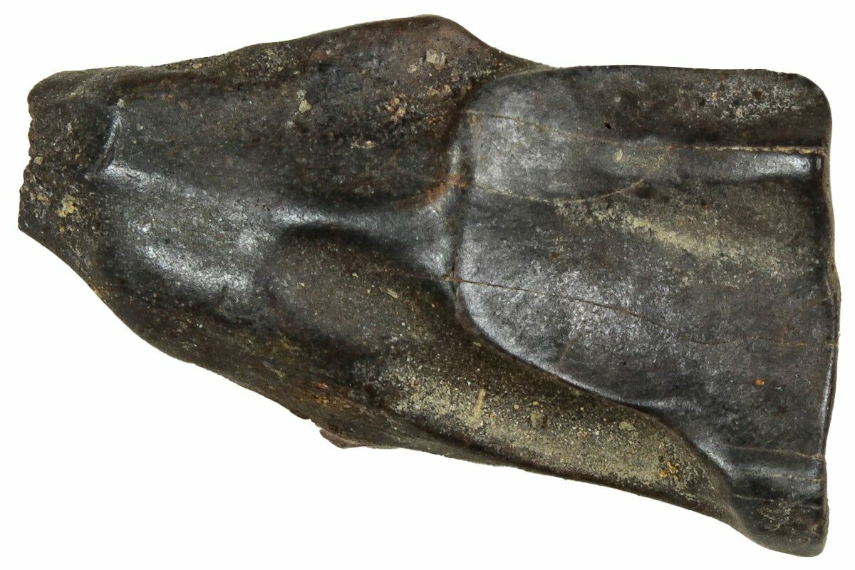 This specimen is one of those naturally shed teeth and features a polished chewing surface, showing clear evidence of the wear that came from processing vegetation millions of years ago.