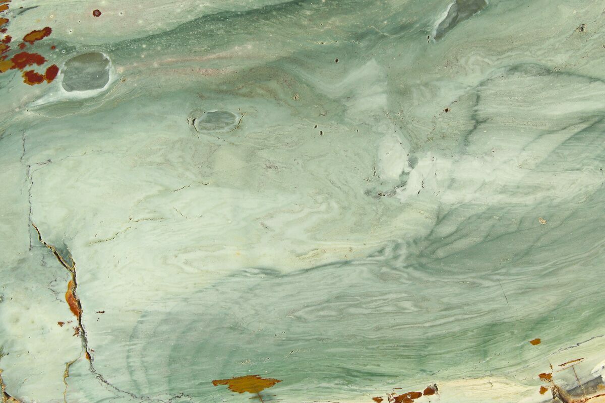 This is a 8.0" wide slab of jasper replaced petrified wood that was collected near McDermitt, Oregon. This specimen has been polished to a glossy finish on one side for aesthetic presentation. It has absolutely stunning blue and green coloration. This slab even has hints of red coloration, indicating the presence of cinnabar!