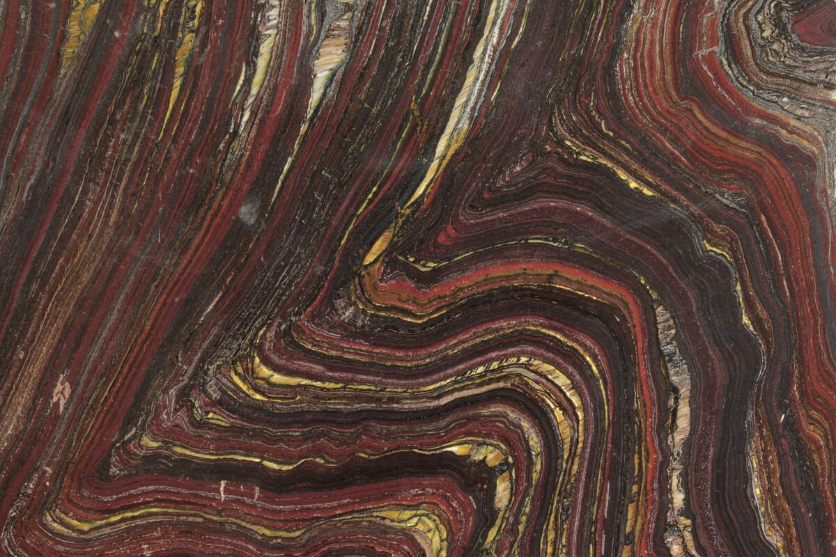 Tiger Iron is composed mainly of tiger's eye, red jasper, and black hematite in an undulating banded pattern. It is mined primarily in two large deposits, one in South Africa and the other in Western Australia. Both deposits are over 2 billion years old!