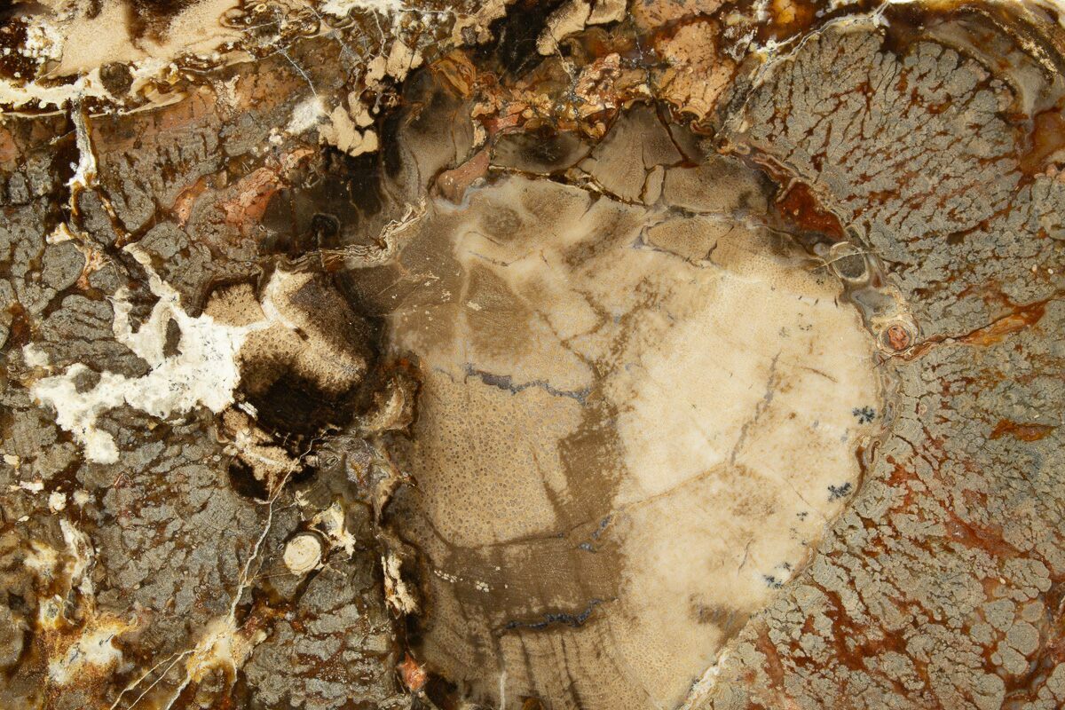 Petrified wood is the name given to wood that has been turned into stone (fossilized) through the process of permineralization. In this process, all of the organic matter becomes replaced by minerals, while much of the original structure, such as tree rings, is retained. For this to happen, the wood needs to be buried in an environment low in oxygen to prevent decomposition and with flowing, mineral-laden water, so minerals may replace structures. The coloration is caused by various minerals/impurities present in the water during fossilization. For example, red colors in many cases can be attributed to iron compounds, greens due to copper, and so on.