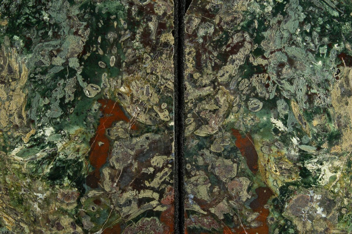 This is a very unique pair of bookends made from jasper replaced petrified wood from Hampton Butte, Oregon. The jasper replacement leaves a beautiful coloration with hues of greens and reds, but unfortunately destroys the detail that would allow for the type of tree to be identified.