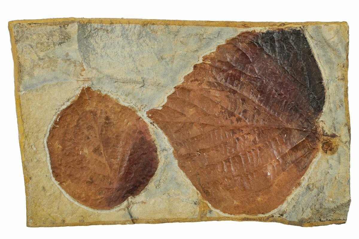These are two fossil leaves (Davidia antiqua) from the Fort Union Formation near Glendive, Montana. The dark orange/brown preservation contrasts well against the shale, and many of the details in the leaves can be seen in good relief. There may be some touchups to the surface of the leaf where some of it flaked onto the negative during collection.