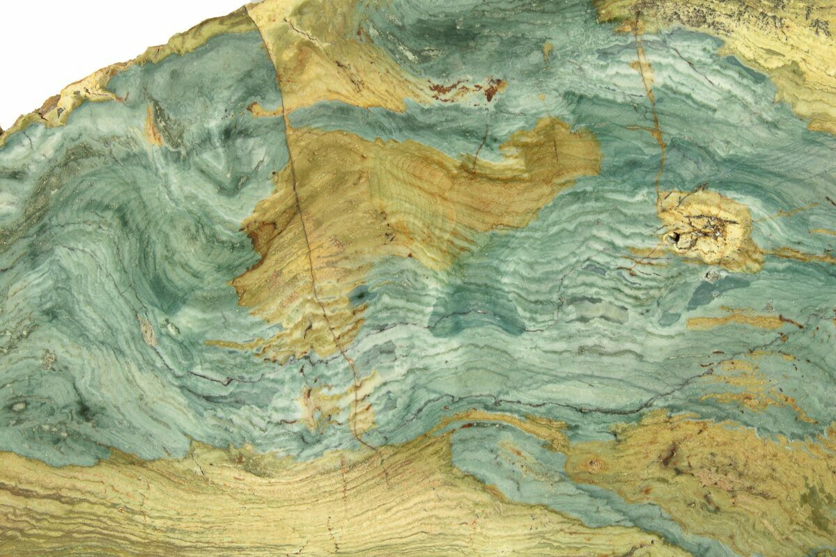 This is a 8.3" wide slab of jasper replaced petrified wood that was collected near McDermitt, Oregon. This specimen has been polished to a glossy finish on one side for aesthetic presentation. It has absolutely stunning blue and green coloration.