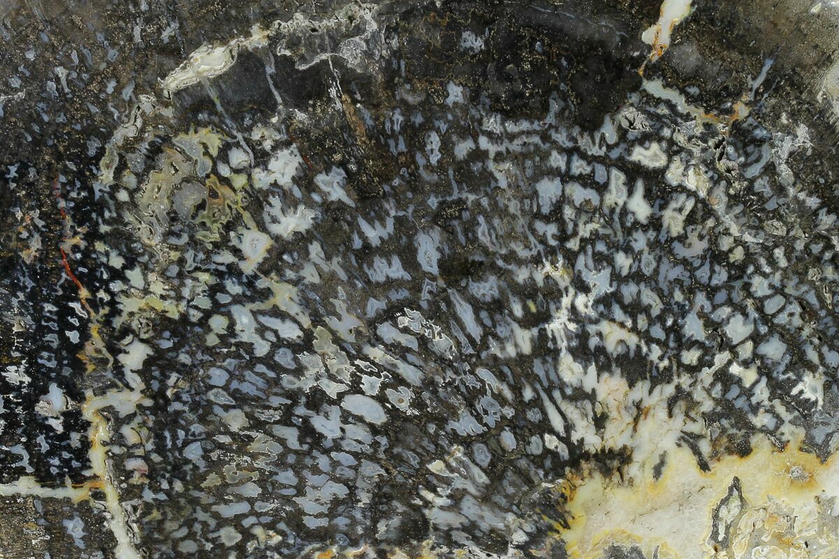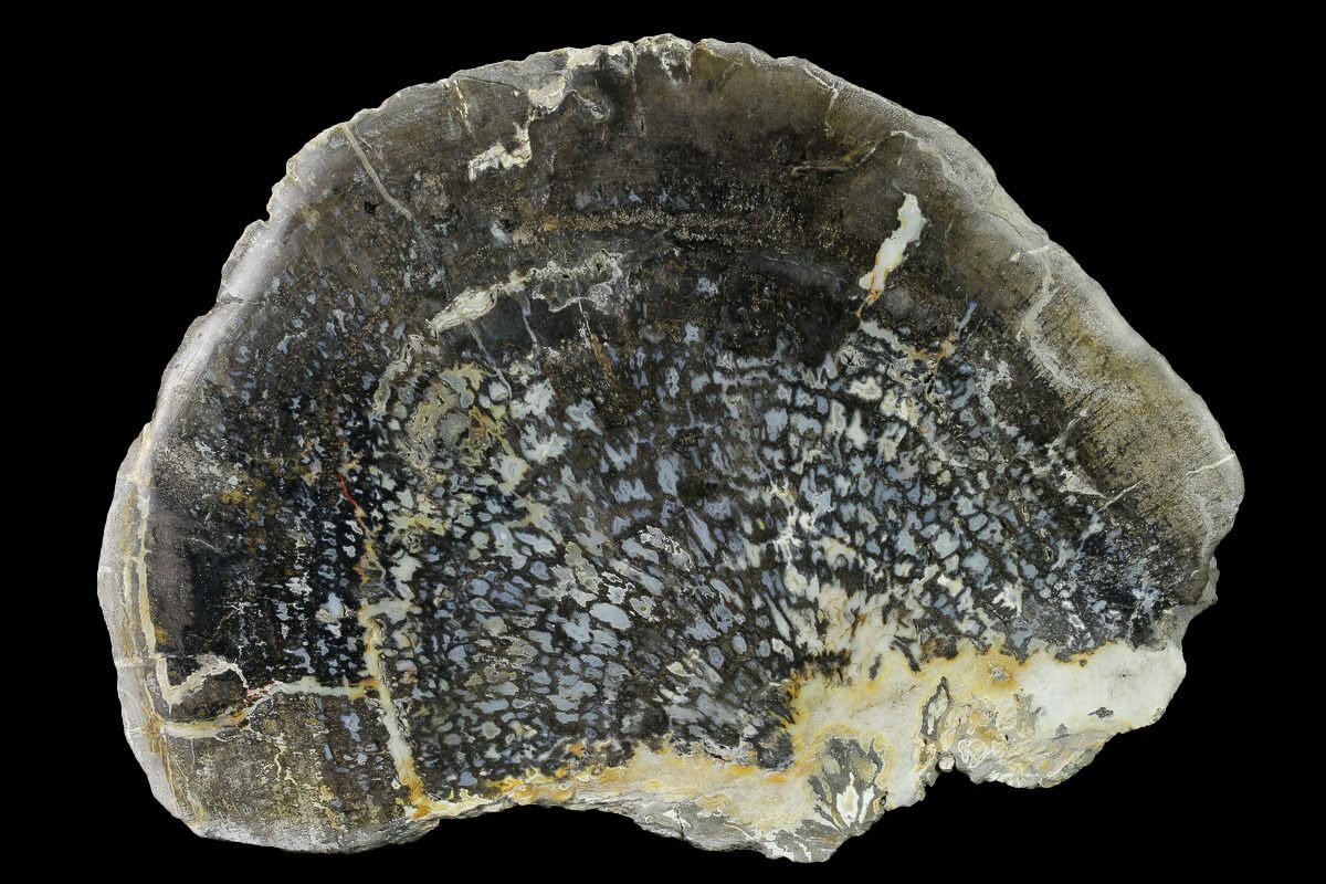 This is a 8.3" wide, polished section of black petrified palm wood from Indonesia. The vascular nature of root means that traditional tree rings are replaced by pores and channels. It has been polished on one side to show off this internal structure.