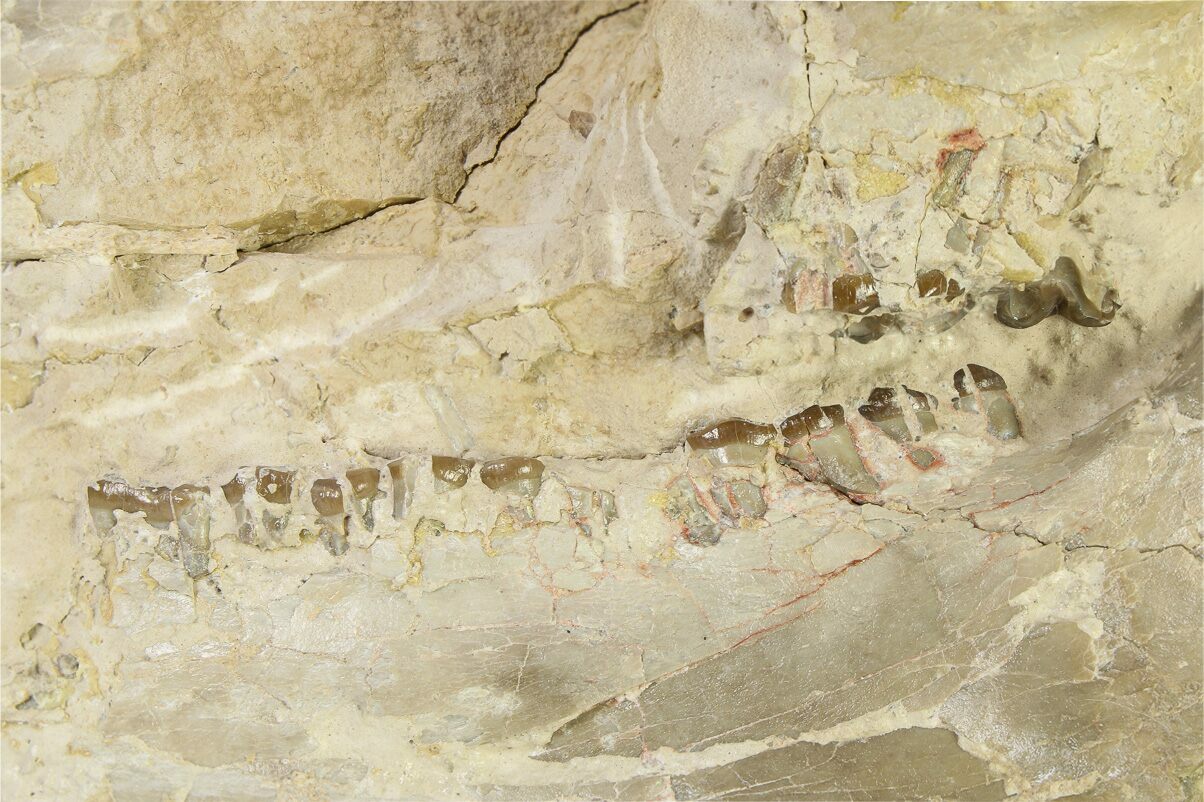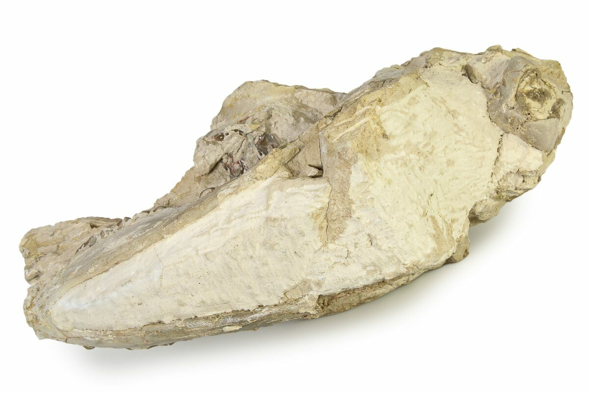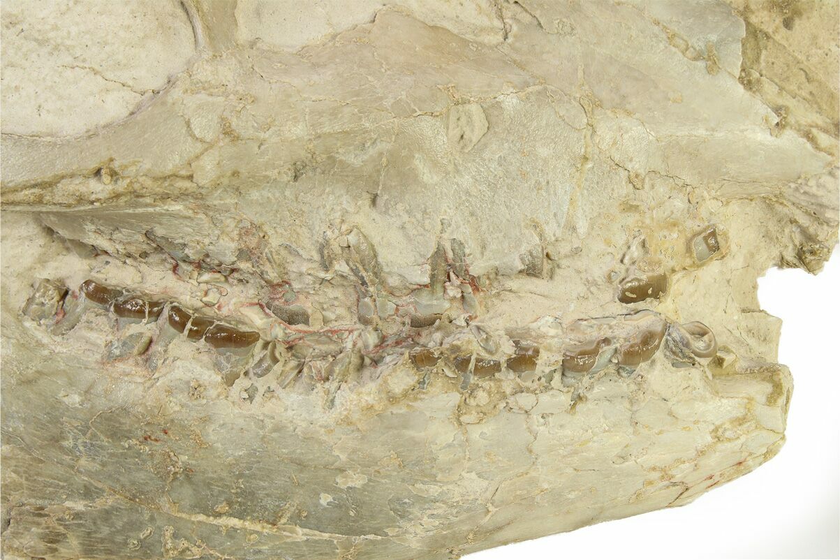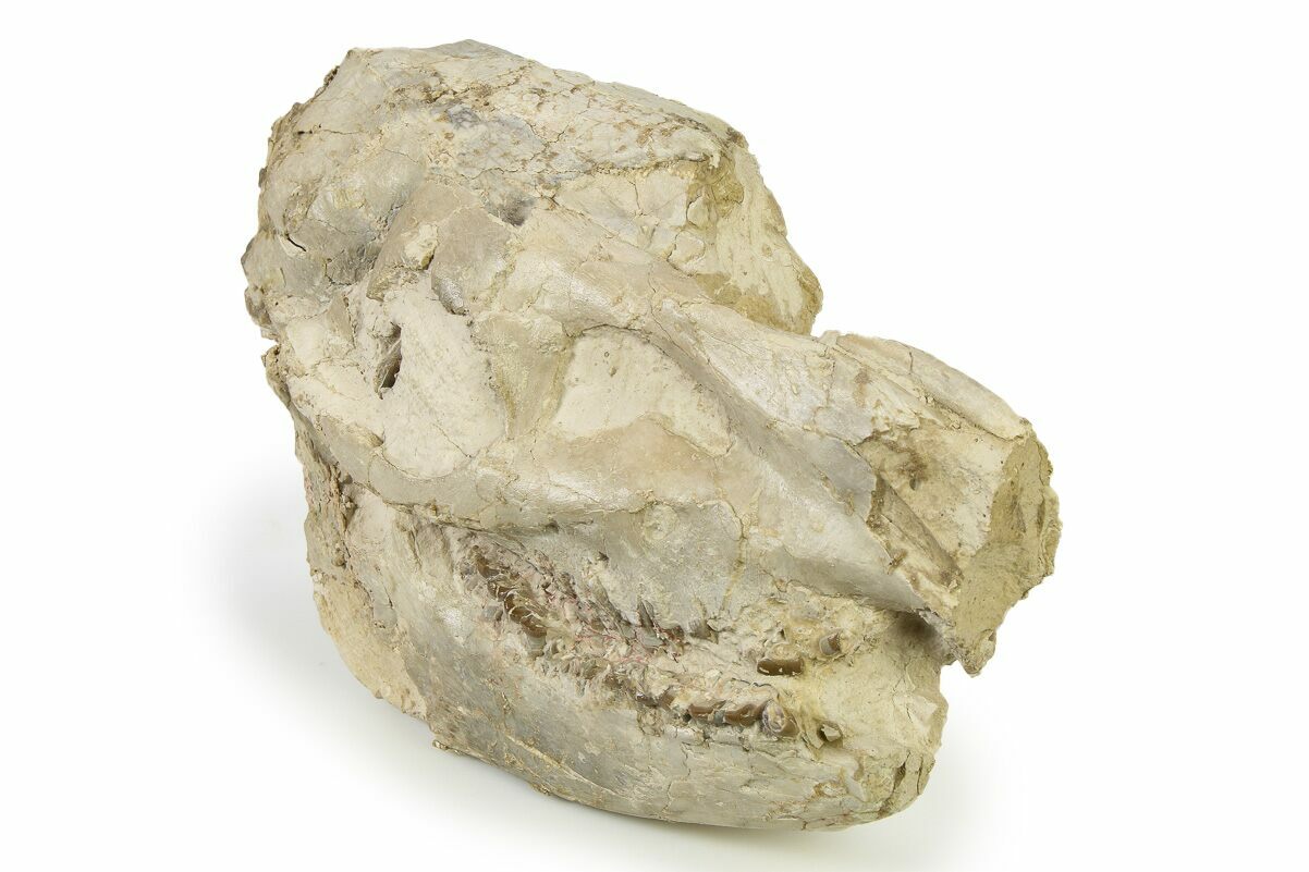 Due to natural crushing, the skull is fragmented in spots, with portions of the upper skull missing. About 70% of the skull is present. All of the bone present is natural and unrestored, though most of the specimen has been glue stabilized to prevent crumbling.