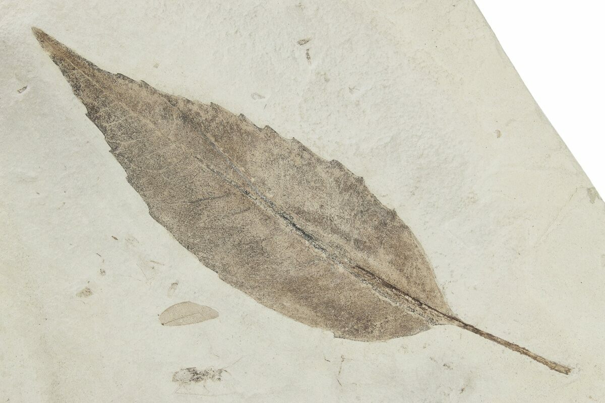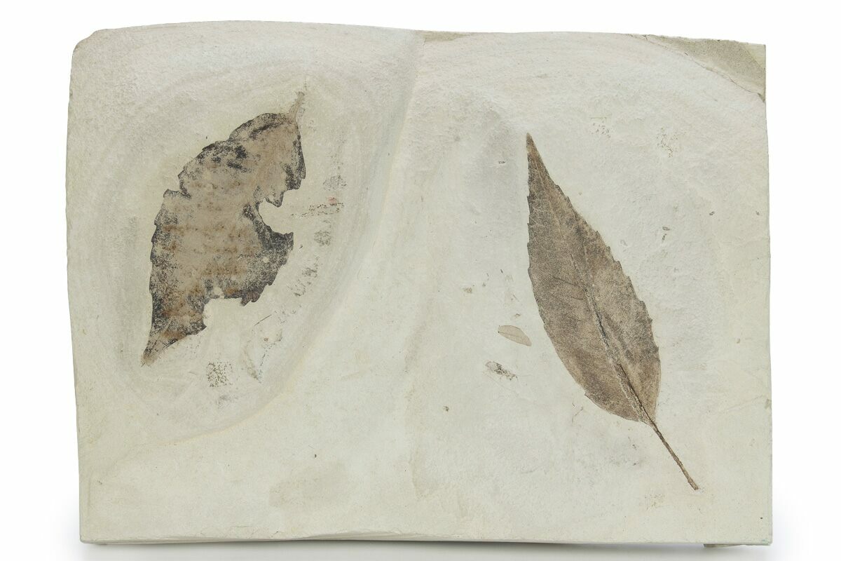 This is a 8.4" wide leaf fossil plate from the Green River Formation of Uintah County, Utah. It contains two leaves representing the species Allphylus flexifolia and Bursera inaequalateral. The Bursera leaf features multiple spots of insect predation.