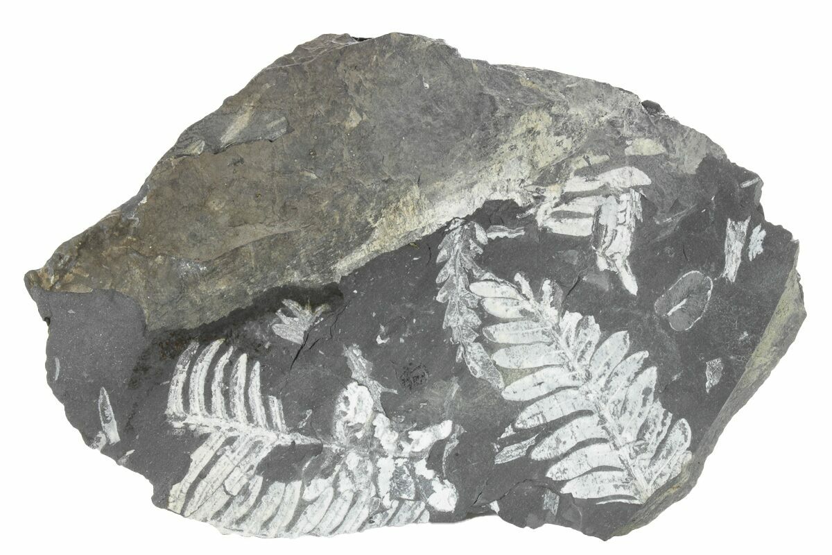 This is a plate of seed fern fossils from the Pennsylvanian aged (308.4 million year) Llewellyn formation of Pennsylvania. The white color of these detailed fern fossils contrasts well against the black shale they are preserved in. These plants were buried in a swamp where a low temperature, pressure, and oxygen environment the plant tissue was slowly replaced by pyrite. This pyrite was later replaced by a whitish mineral (aluminum silicate) as the fossils were buried and exposed to the heat and pressure inside of the earth. There are multiple types of seed ferns (which look very similar) on these plates including Alethopteris and Pecopteris.