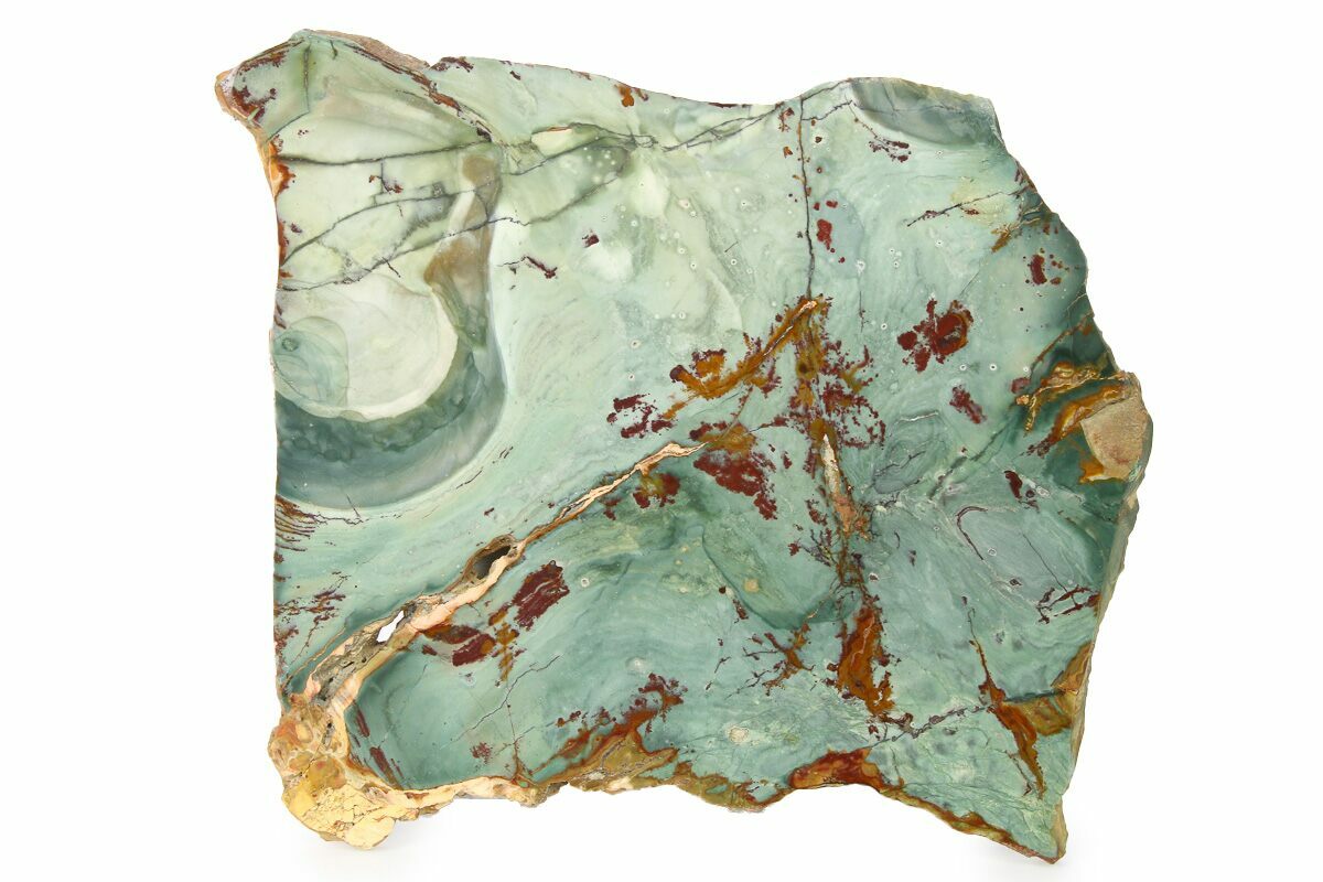 This is a 8.4" wide slab of jasper replaced petrified wood that was collected near McDermitt, Oregon. This specimen has been polished to a glossy finish on one side for aesthetic presentation. It has absolutely stunning blue and green coloration. This slab even has small amounts of red coloration, indicating the presence of cinnabar!