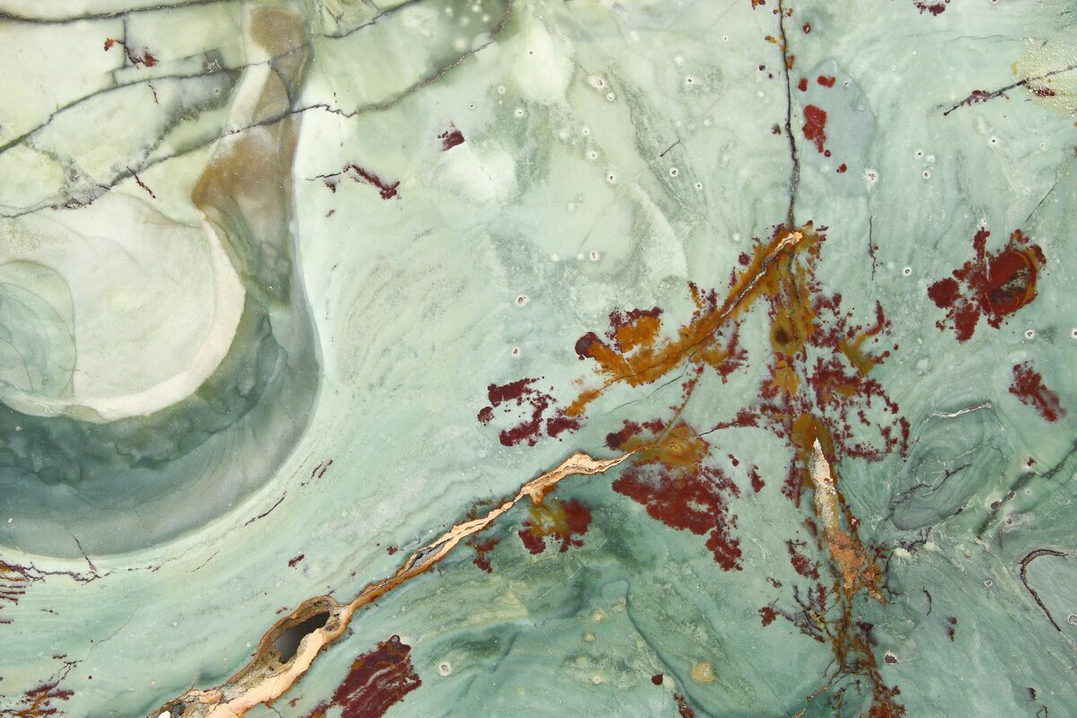 Gary Green Jasper, also referred to as petrified bog wood or Larsonite, is a form of petrified wood from a location near McDermitt, Oregon on the Nevada/Oregon border. It is believed to be wood covered by volcanic activity between 11-15 million years ago. The volcanic event covered this area in debris that deprived the plants of oxygen, halting the decay process. Minerals from the volcanic ash then acted as the replacement material for this petrification/mineralization, giving the wood these vibrant colors.