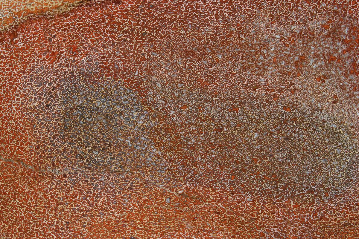 Dinosaur gembone (agatized dinosaur bone) forms when the porous structure of dinosaur bone is replaced by silica-rich minerals like agate, chalcedony, or jasper. This preserves the bone’s internal cell patterns, creating striking, web-like textures visible when polished.