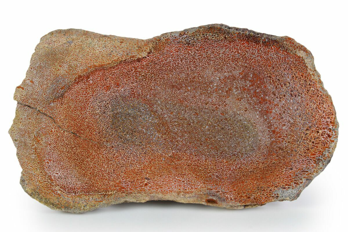 This is a vibrant, 8.4" wide slab of polished agatized dinosaur bone (gembone) from the Morrison Formation in New Mexico. Beautiful bright red colored cells on this specimen. It is cut flat on both sides and polished to a glossy finish on one.