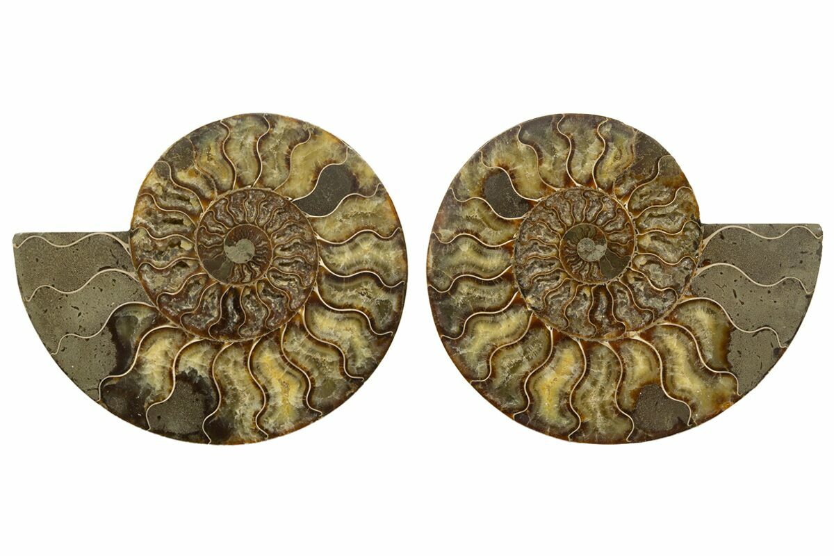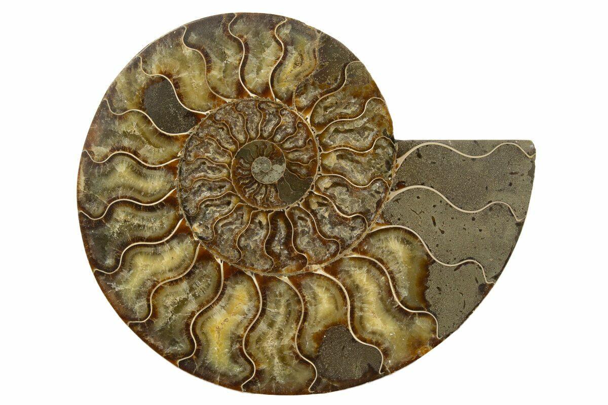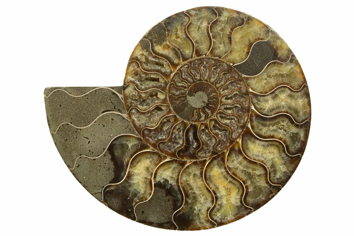 It exhibits gorgeous mineralization within the chambers, each separated by white calcite septa (divisions). This highly polished, exotic ammonite makes a superb display piece with tremendous historical appeal.