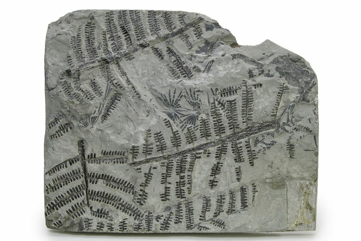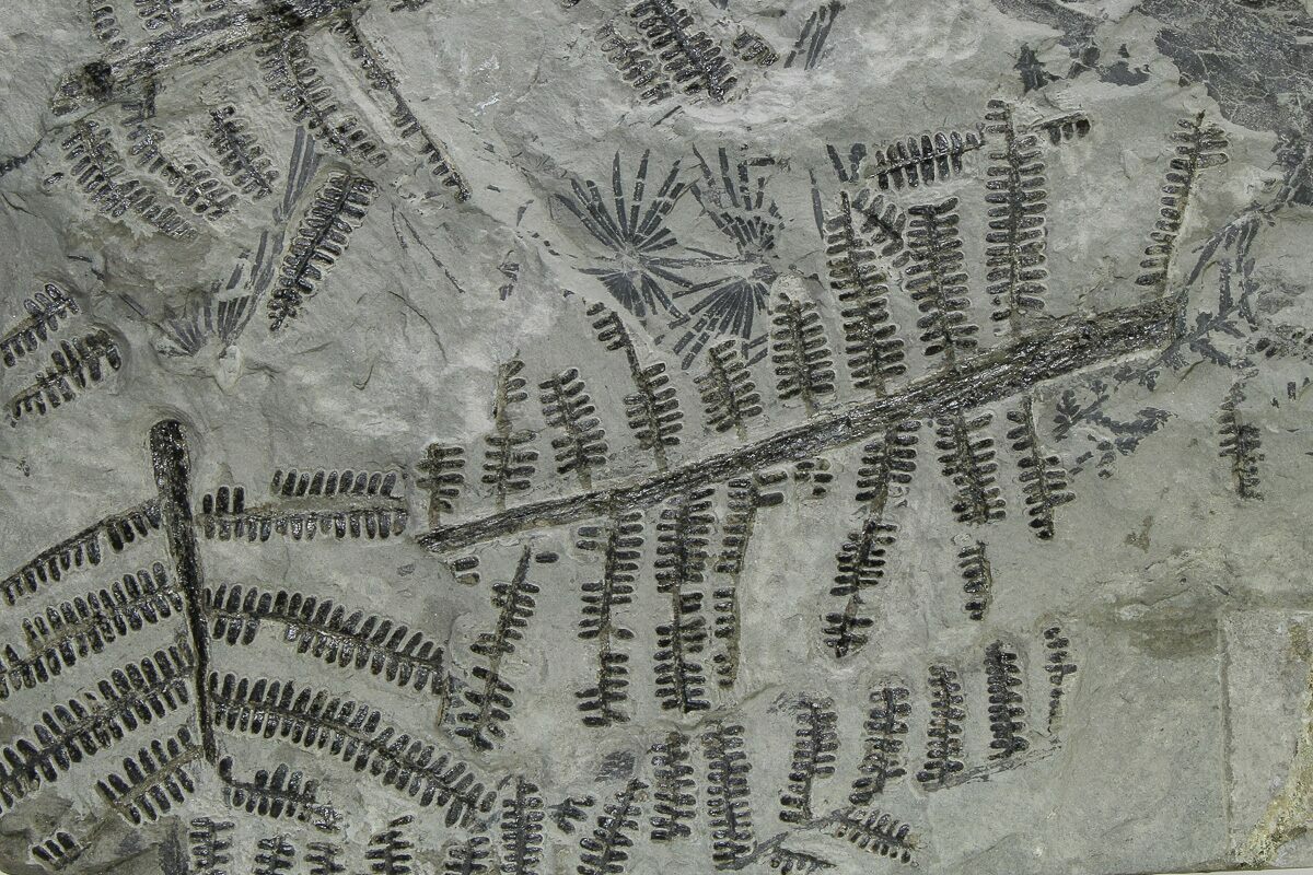 This is a fascinating fossil fern and horsetail plate from the Late Carboniferous-aged Montceau-les-Mines Lagerstatte of France. This formation is Stephanian Stage in age, or approximately 300 million years old. The ferns include Pecopteris paleacea a two whorls of the horsetail, Annularia stellata. The entire specimen measures 8.5 x 6.9".