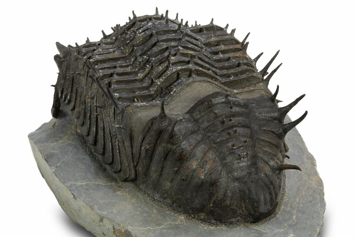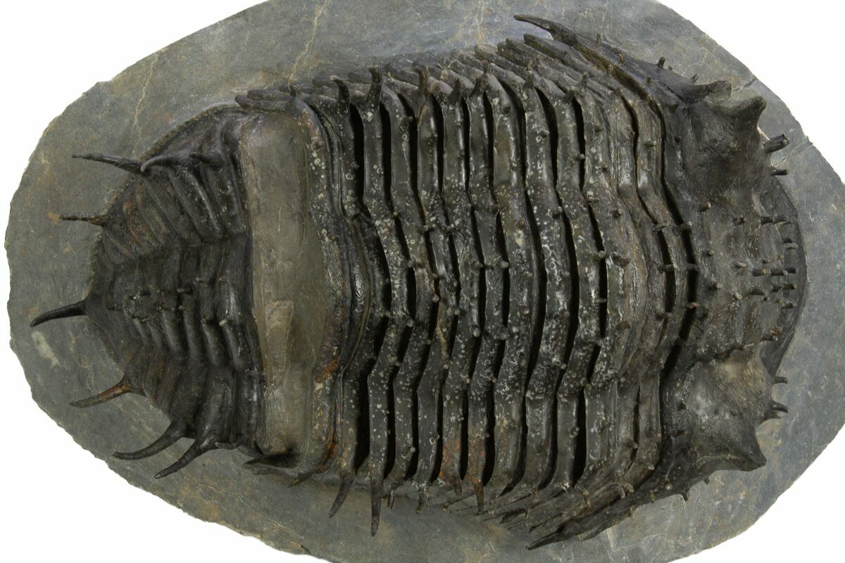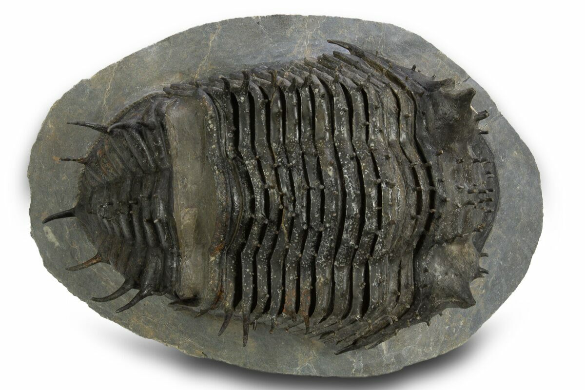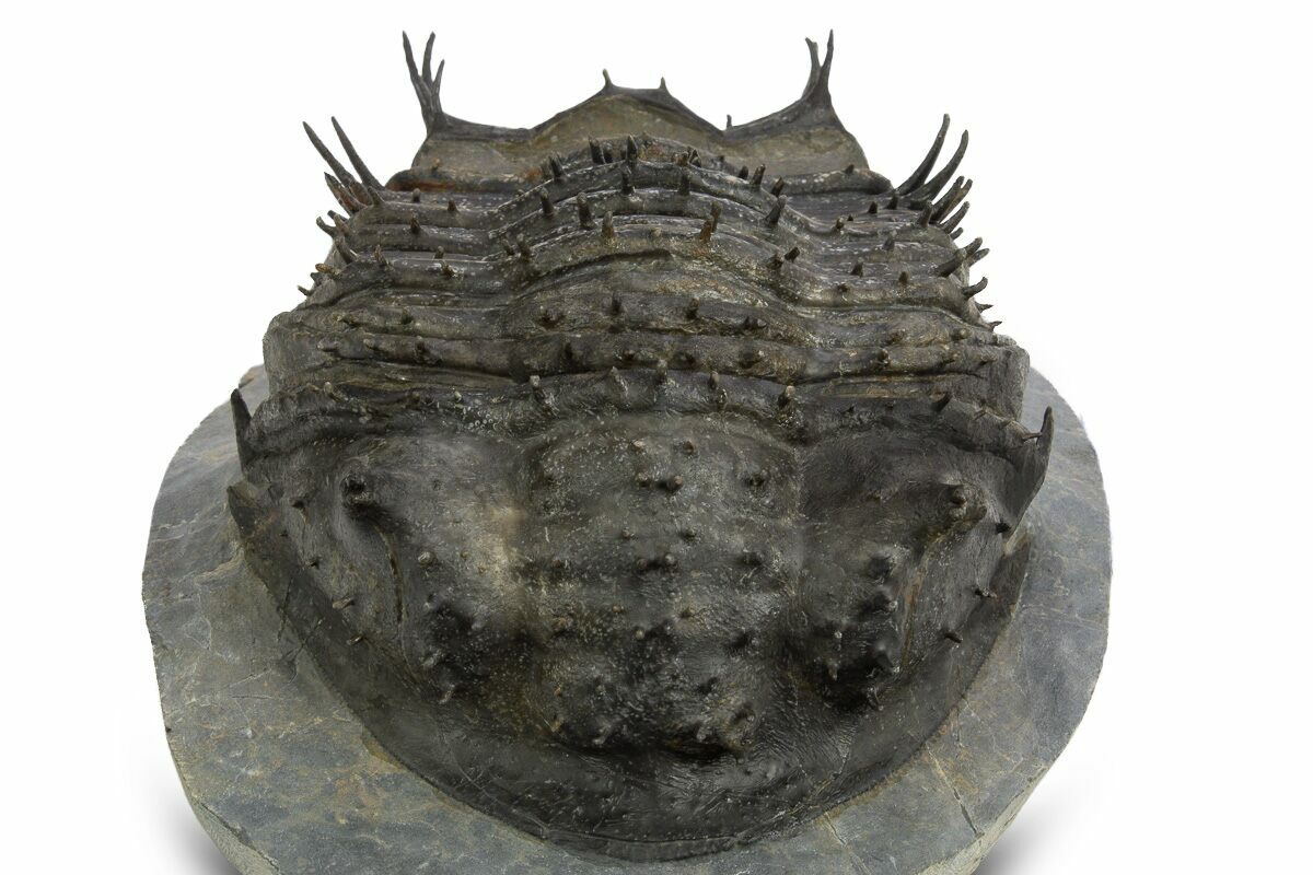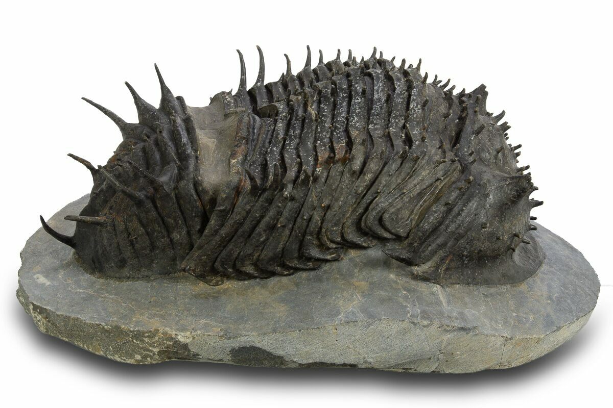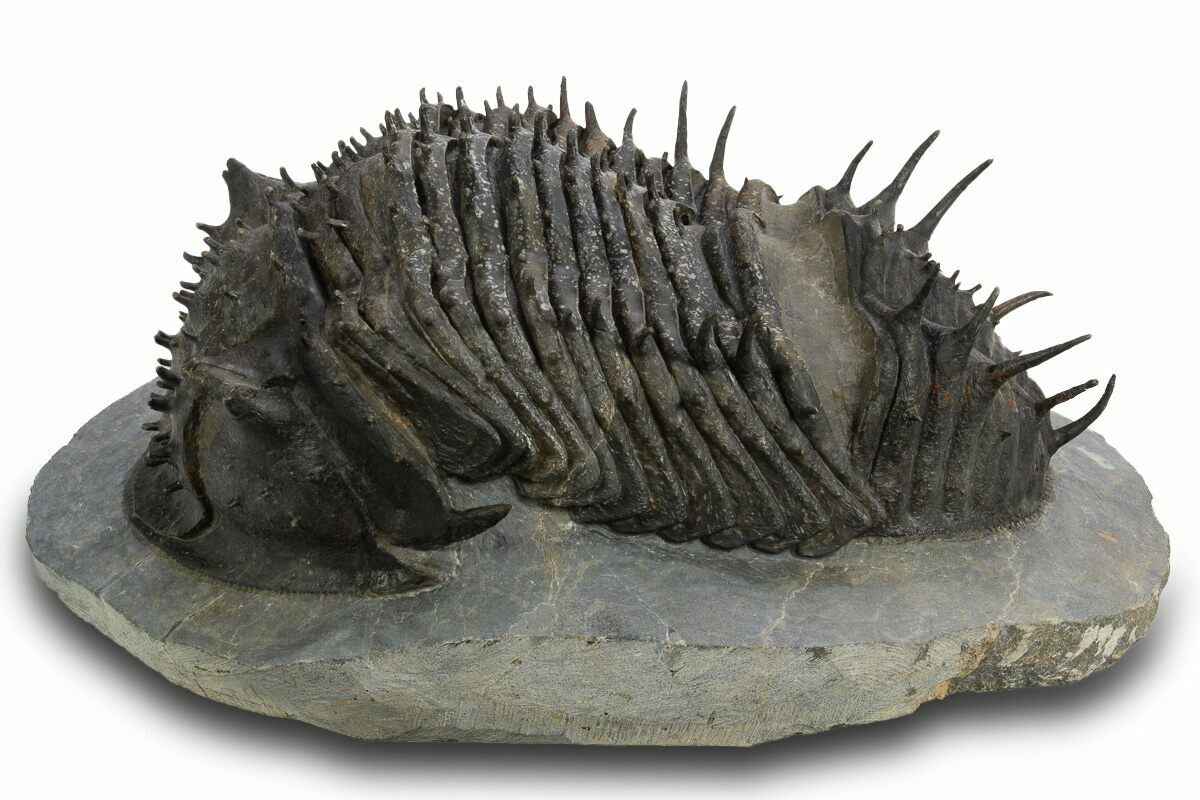 This is an incredible, giant, spiny Scabrella trilobite from Issoumour, Morocco. Despite numerous fake, composited, and heavily restored specimens of this giant, porcupine-like trilobite finding their way onto the market, only a small number complete specimens have ever been found.