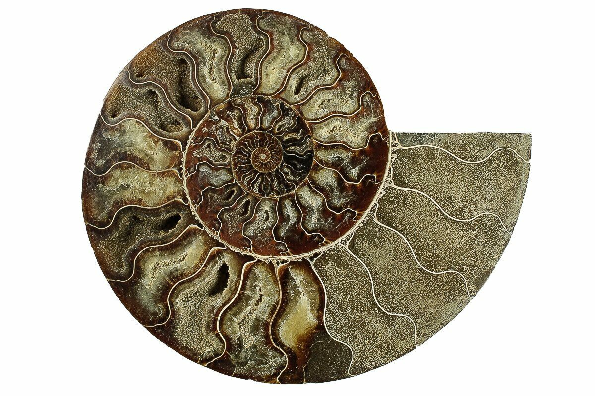 This specimen exhibits gorgeous mineralization within the chambers, each separated by white calcite septa (divisions). This highly polished, exotic ammonite makes a superb display piece with tremendous historical appeal.