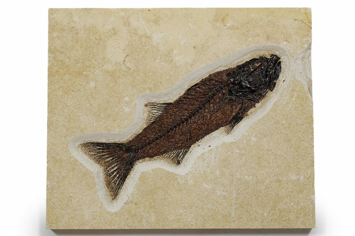 Specimens like this come from the coveted 18 inch layer of the Green River Formation, which produces darker and more detailed fish than the majority on the market. The rock from this layer is much harder and more durable than other layers in the formation, likely due to its initial deposition conditions in deep water. Because of these conditions, fish found in the 18-inch layer can be extracted whole and in excellent condition. This layer is typically collected at night using low-angle light to see the bump in the rock that the fish's backbone creates. They then cut these fish out and take them to a lab where the fish, which may be up to an inch under the surface of the rock, are meticulously extracted under microscope with hand tools.
