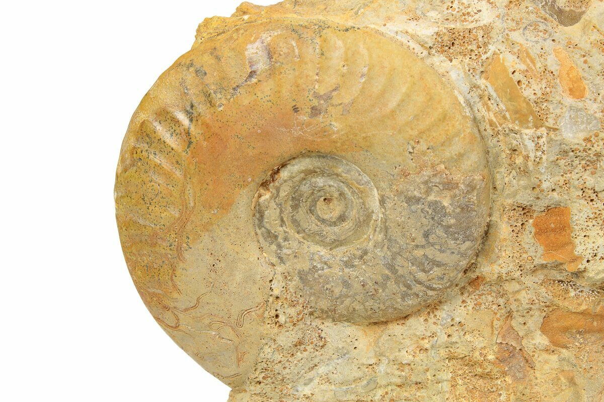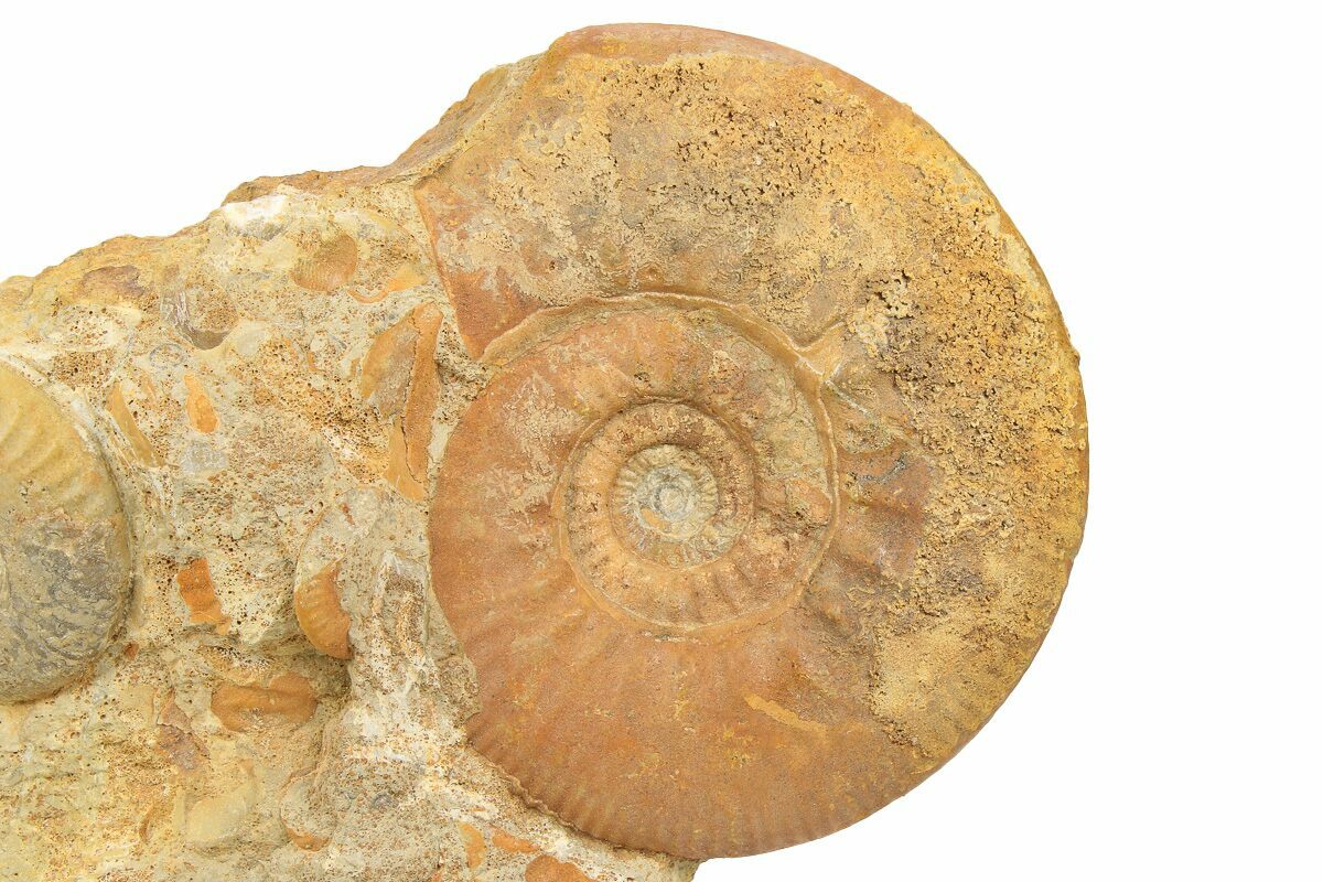 This is a beautiful, 8.6" wide, natural association of two ammonite fossils, collected from a location near Poitiers, France. They are Callovian (Jurassic period) in age, or approximately 165 million years old. The largest ammonite (Choffatia sp.) measures 5.3" wide, and the smaller ammonite (Hecticoceras sp.?) to the left is 3.1" wide.