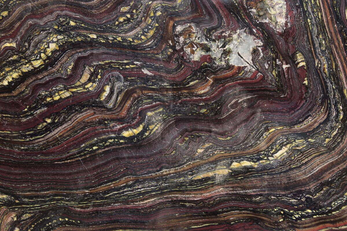 Tiger Iron is composed mainly of tiger's eye, red jasper, and black hematite in an undulating banded pattern. It is mined primarily in two large deposits, one in South Africa and the other in Western Australia. Both deposits are over 2 billion years old!