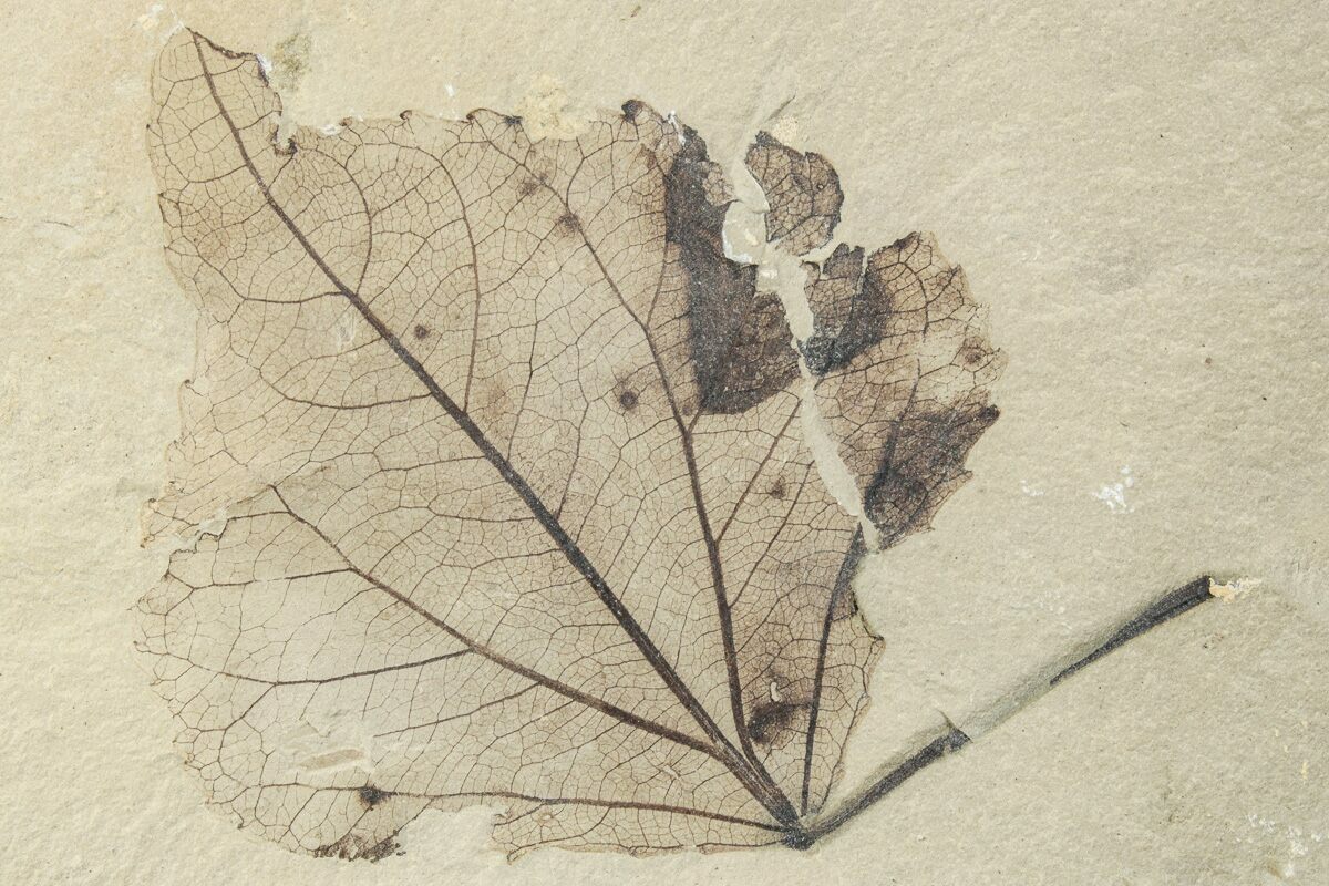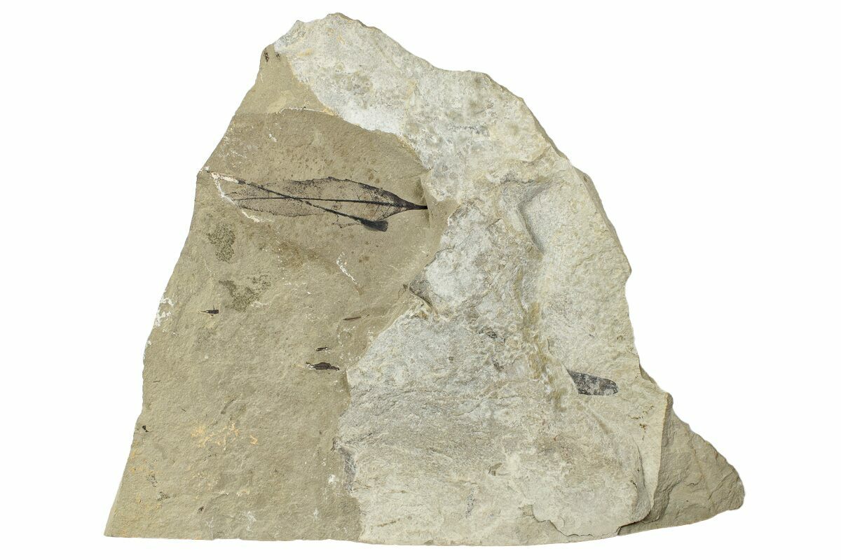 This is an interesting fossil leaf plate from the Green River Formation, Utah. It contains a poplar (Populus) leaf (2.5") on one side, and a leaf (2.65") of the sumac family (Rhus) intersected by a stem on the other side.