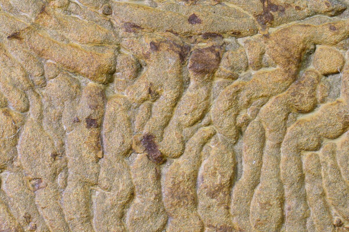 This is a 8.7" wide section of microbial "mat" from the Hartshorne Sandstone of Haskell County, Oklahoma. Also known as "MISS" (Microbially Induced Sedimentary Structures) it's the fossilized ichnofossils left behind by a colony of microbes, similar to the formation of stromatolites..