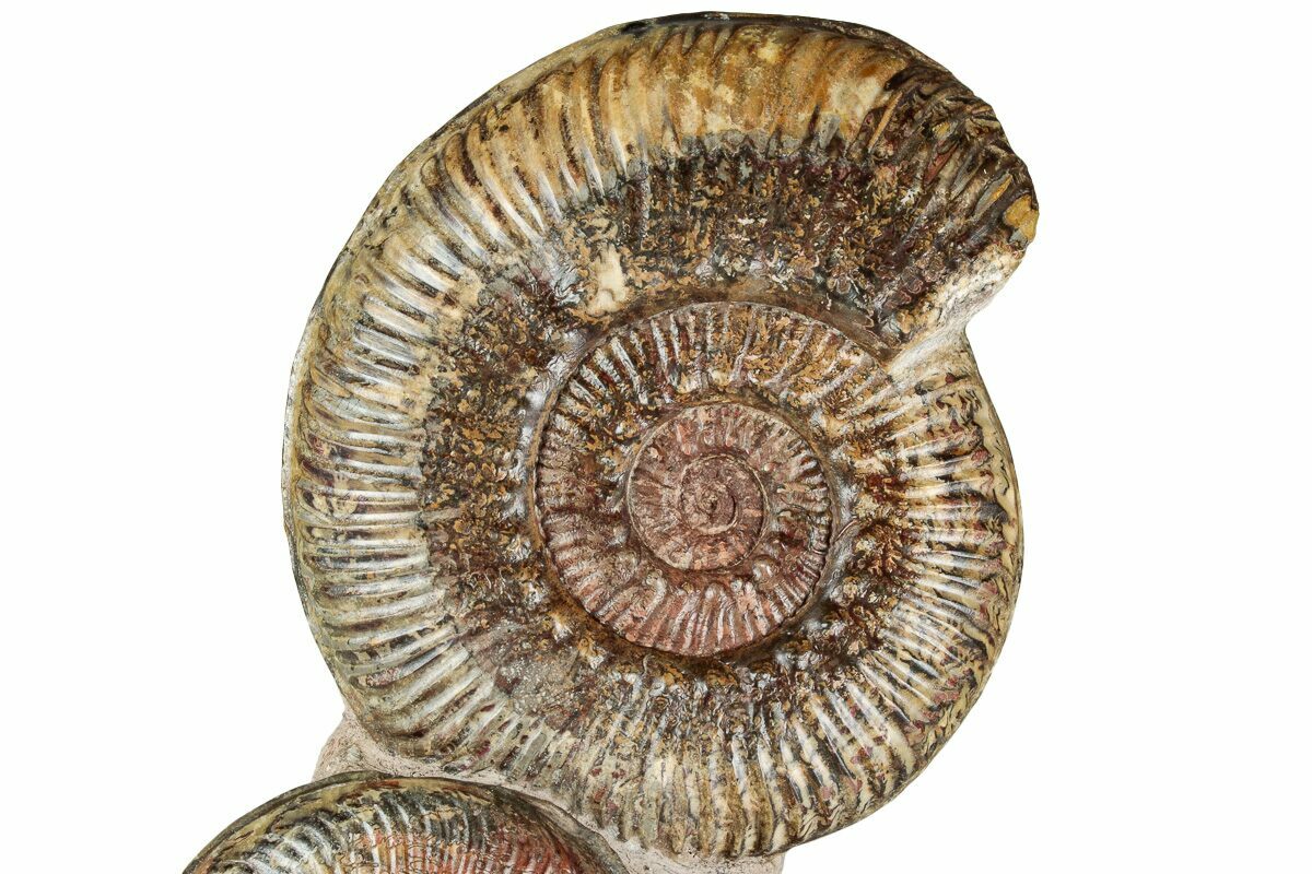 This is a beautiful display piece featuring a pair of Hammatoceras and Pseudogrammoceras ammonites from Belmont, France. It measures 8.7" tall and the base of stone has been cut flat so that is displays nicely on a hard surface without the need for a display stand. These ammonite fossils are Lower Jurassic (Toarcian Stage) in age, or around 180 million years old.