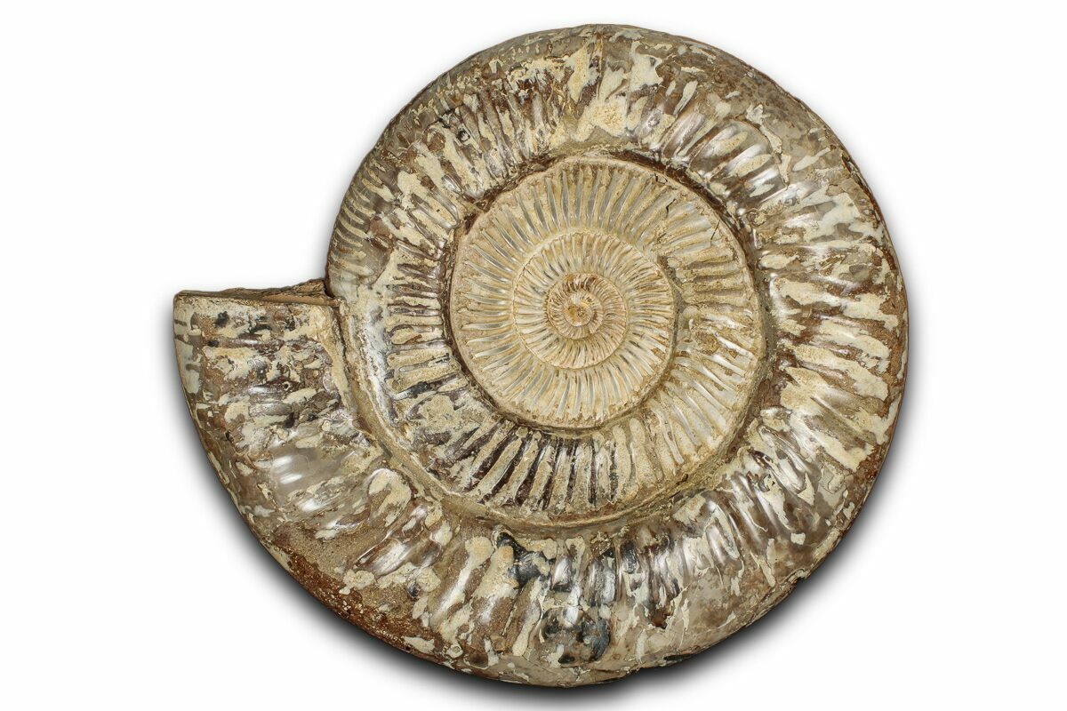 This is a 8.9" wide ammonite (Perisphinctes sp.) fossil that was collected near Sakaraha in the Tulear Province of Madagascar. It is Jurassic (Oxfordian Stage) in age, or approximately 160 million years old. It has a well defined ribbing and is quite heavy. The exterior has been lightly polished and it comes with an acrylic-metal display stand.