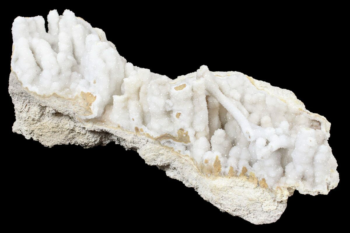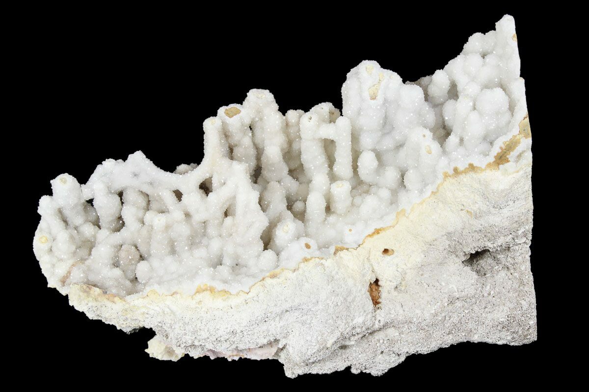 On this specimen, the chalcedony formed in stalactitic masses that are encrusted in druzy crystals. The coral has been cut flat on one side for ease of display.