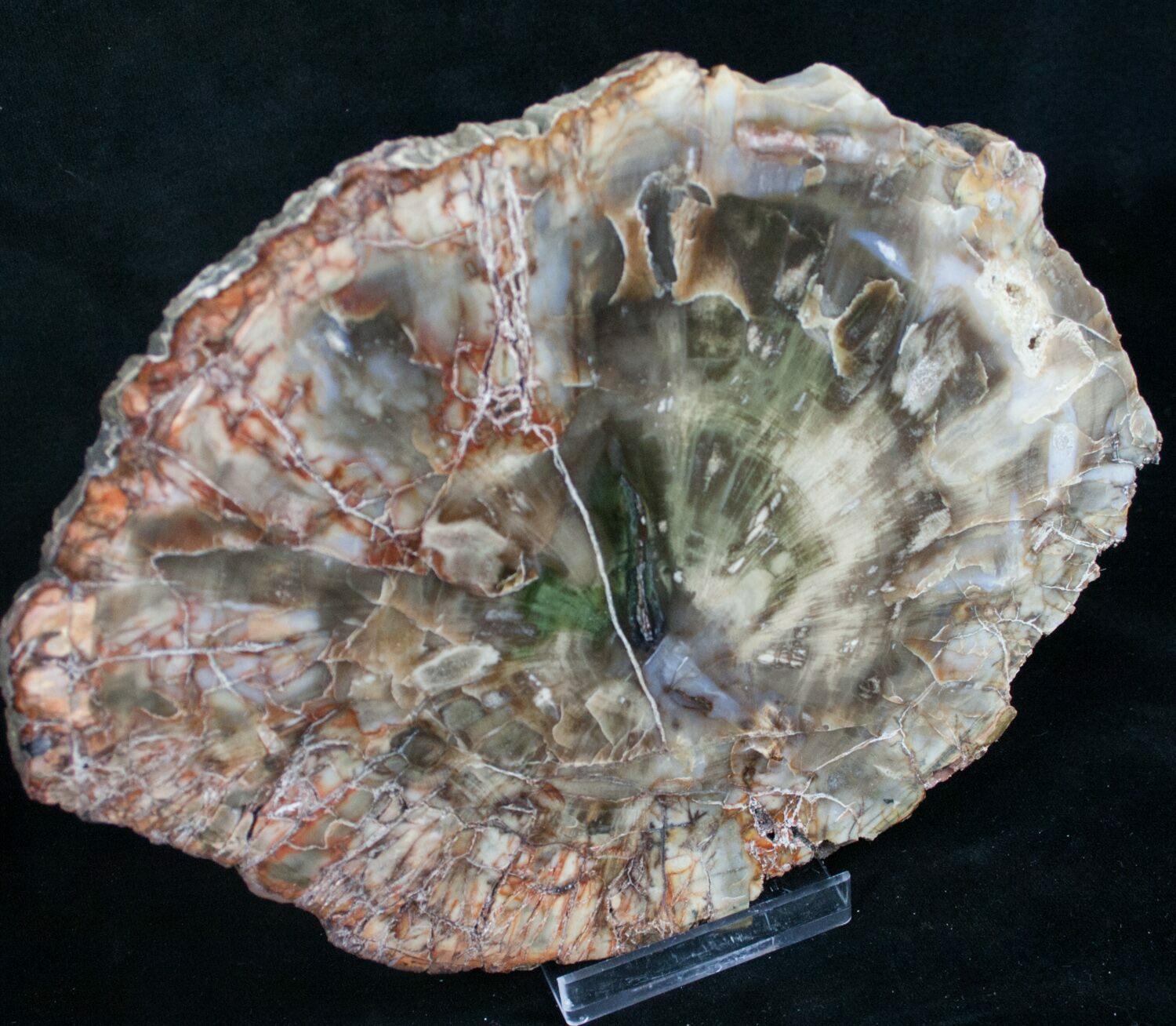 This is a richly colored slab of petrified Araucaria (Conifer) wood from Ambilobe, Madagascar. This 220 million year old petrified wood has been sliced and polished allowing the stunning inner wood detail and fantastic coloration to easily be seen. It comes with an acrylic display stand.