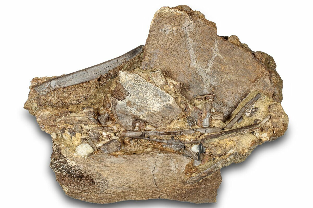 This 8" wide piece of sandstone contains dinosaur bone fragments, a partial tooth, and ossified tendons that have all been left in their natural positions within the rock. It was collected from the Lance (Creek) Formation of Wyoming. Based on abundance at this site, the bones, tooth, and tendons are all likely from Edmontosaurus annectens.