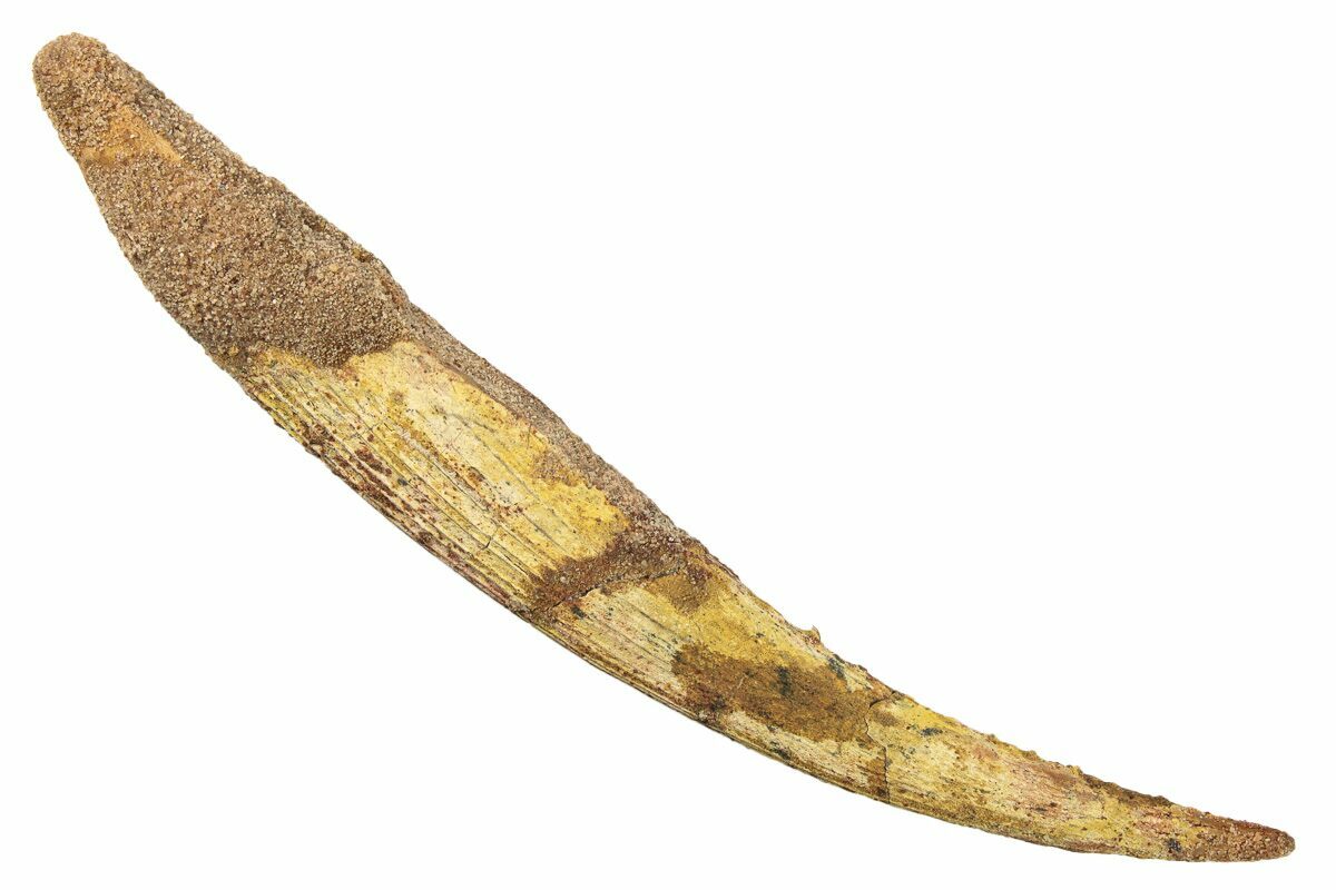 This is a 8" long fossil dorsal spine of a shark (Hybodus obtusus). It comes from the Late Cretaceous-aged Kem Kem Beds near Taouz, Morocco. These spines are relatively delicate so they are almost always fractured while in the ground or during collection. This one has multiple crack repairs along its length and significant stabilization through its proximal end.