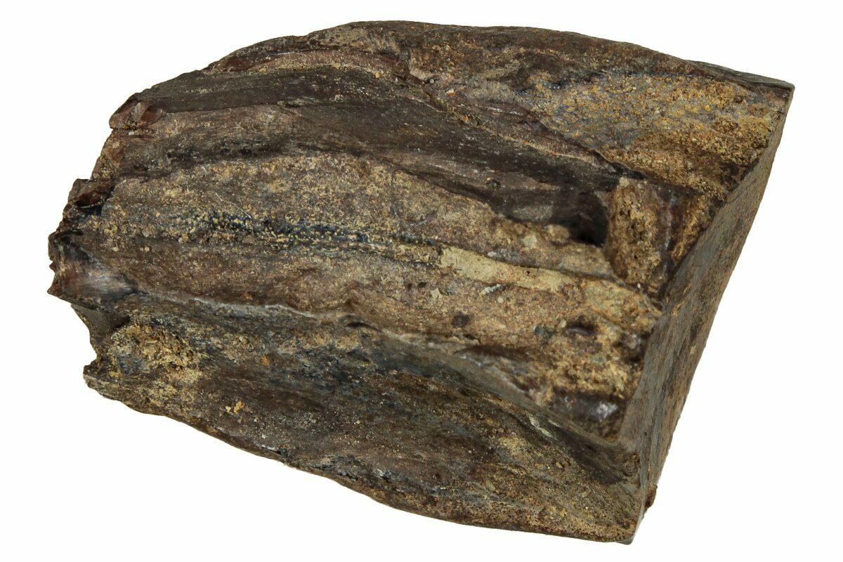 This specimen is one of those naturally shed teeth and features a polished chewing surface, showing clear evidence of the wear that came from processing vegetation millions of years ago.