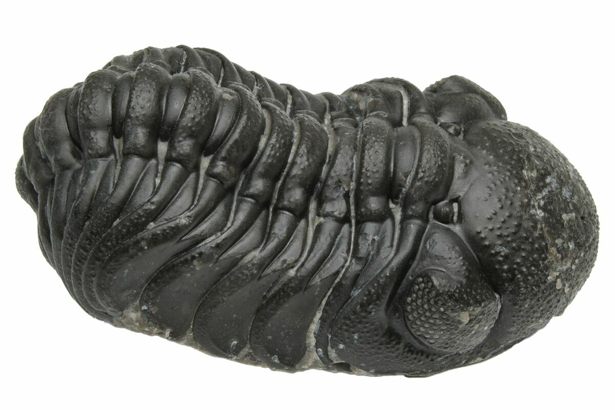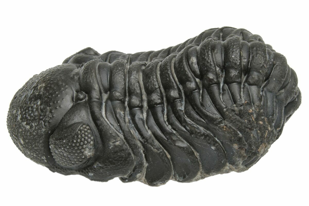 This is a curled, .85" wide Austerops trilobite from Morocco. Good eye facet detail in both eyes.