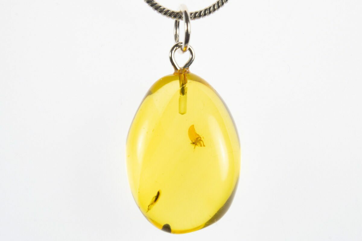 This is a .85" tall (including loop) pendant made from 44 million year old Baltic amber. Within the amber, a small unidentified insect can be seen. A loop has been attached to the amber, along with a secondary ring for the included 24" silver plated snake chain to complete the necklace.