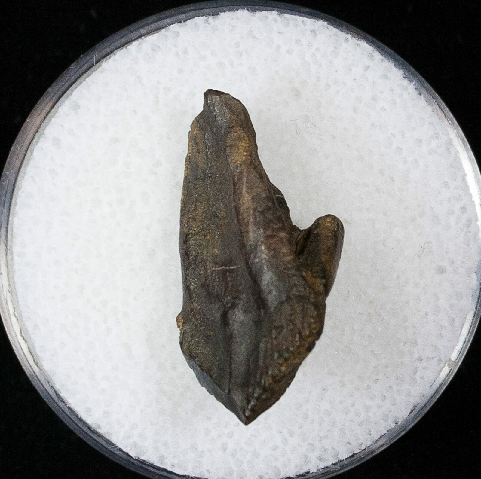 This tooth exhibits almost no feeding wear and still has a substantial portion of the root attached so it isn't one of this discarded teeth. The small size would indicate this came from a juvenile.