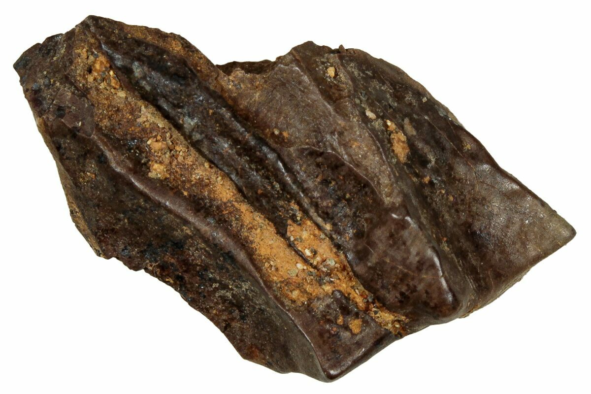 This specimen is one of those naturally shed teeth and features a polished chewing surface, showing clear evidence of the wear that came from processing vegetation millions of years ago.