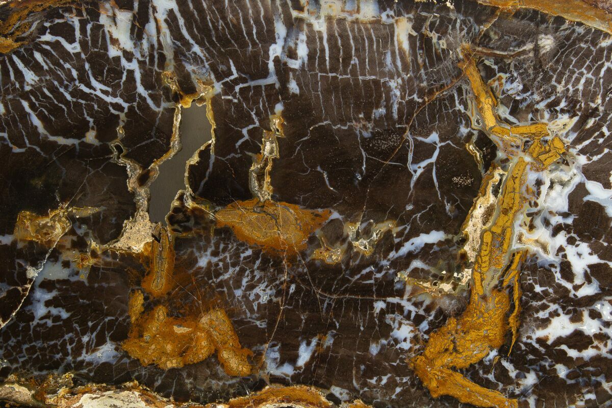 This is a colorful 9.05" slab of petrified shrinkwood that was collected from Parker, Colorado. The term "shrinkwood" refers to wood that following preservation, became fragmented, resulting in small cavities that become naturally "glued" back together by silica-rich fluids (chalcedony).