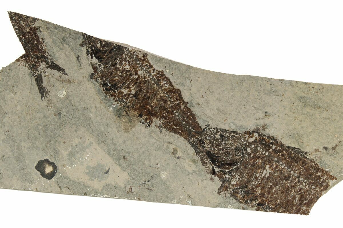 This is a 9.1" wide fossil fish plate collected from the "gastropod layer" of the Clear Creek Quarry at the Green River Formation of Wyoming. The shale contains multiple partial fossil fish (Knightia eocaena) that are naturally associated with each other and bear red-brown and black preservation.