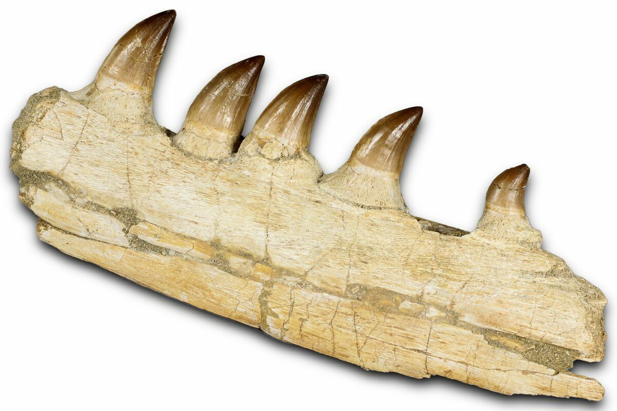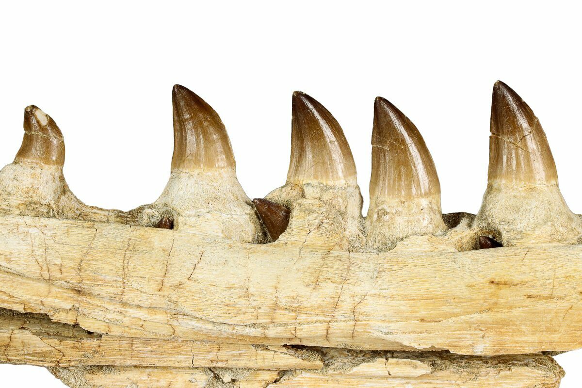 This is a 9.1" fossil jaw section of a mosasaur (Prognathodon sp.) from the Phosphate Deposits near Khouribga, Morocco. There are five beautifully preserved teeth still attached to the jaw, as well as three "unerupted" teeth within the jaw, though we suspect they have been imbedded for aesthetic appeal.