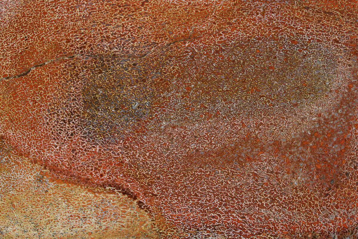 Dinosaur gembone (agatized dinosaur bone) forms when the porous structure of dinosaur bone is replaced by silica-rich minerals like agate, chalcedony, or jasper. This preserves the bone’s internal cell patterns, creating striking, web-like textures visible when polished.
