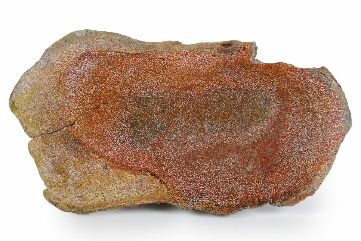This is a vibrant, 9.1" wide slab of polished agatized dinosaur bone (gembone) from the Morrison Formation in New Mexico. Beautiful bright red colored cells on this specimen. It is cut flat on both sides and polished to a glossy finish on one.