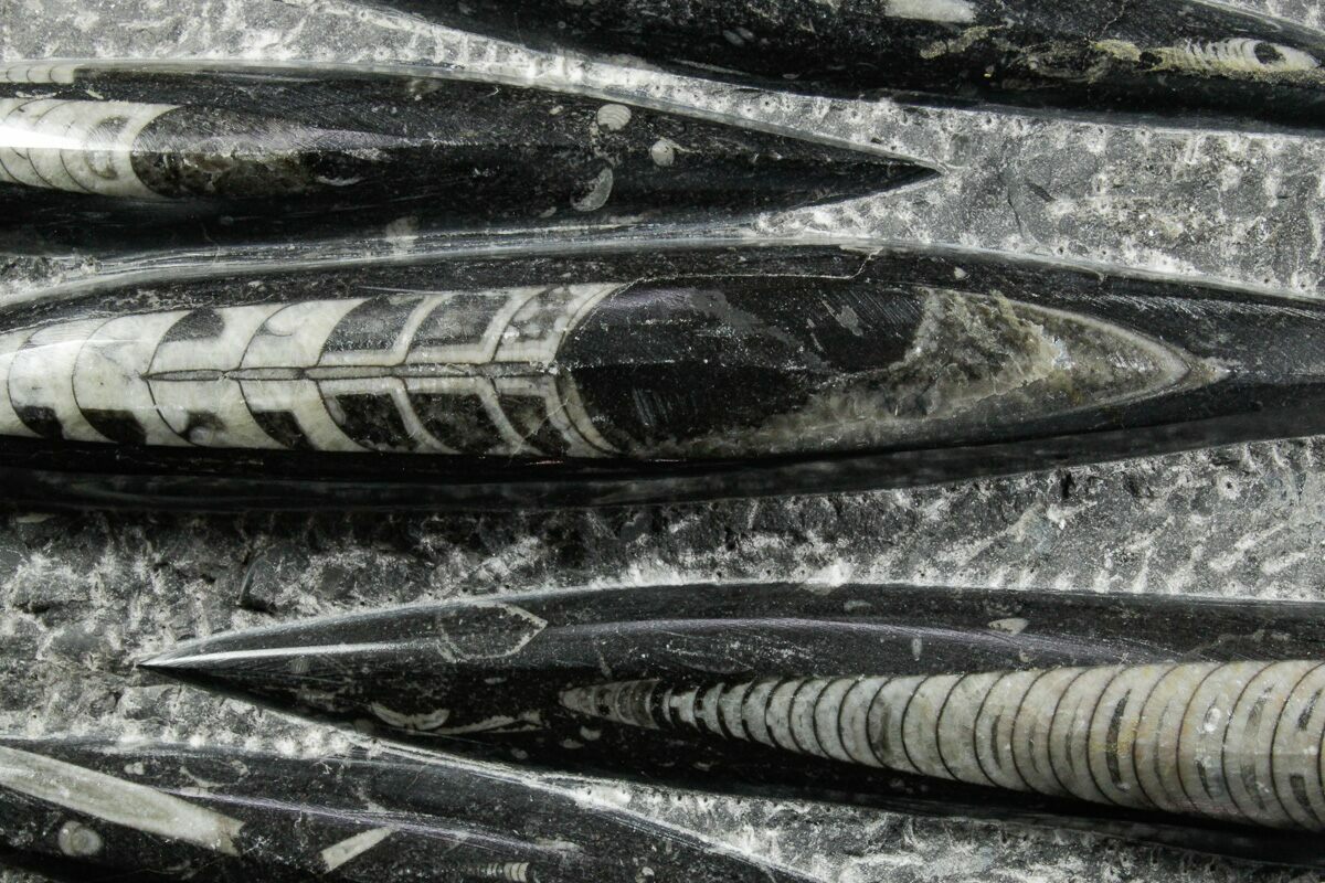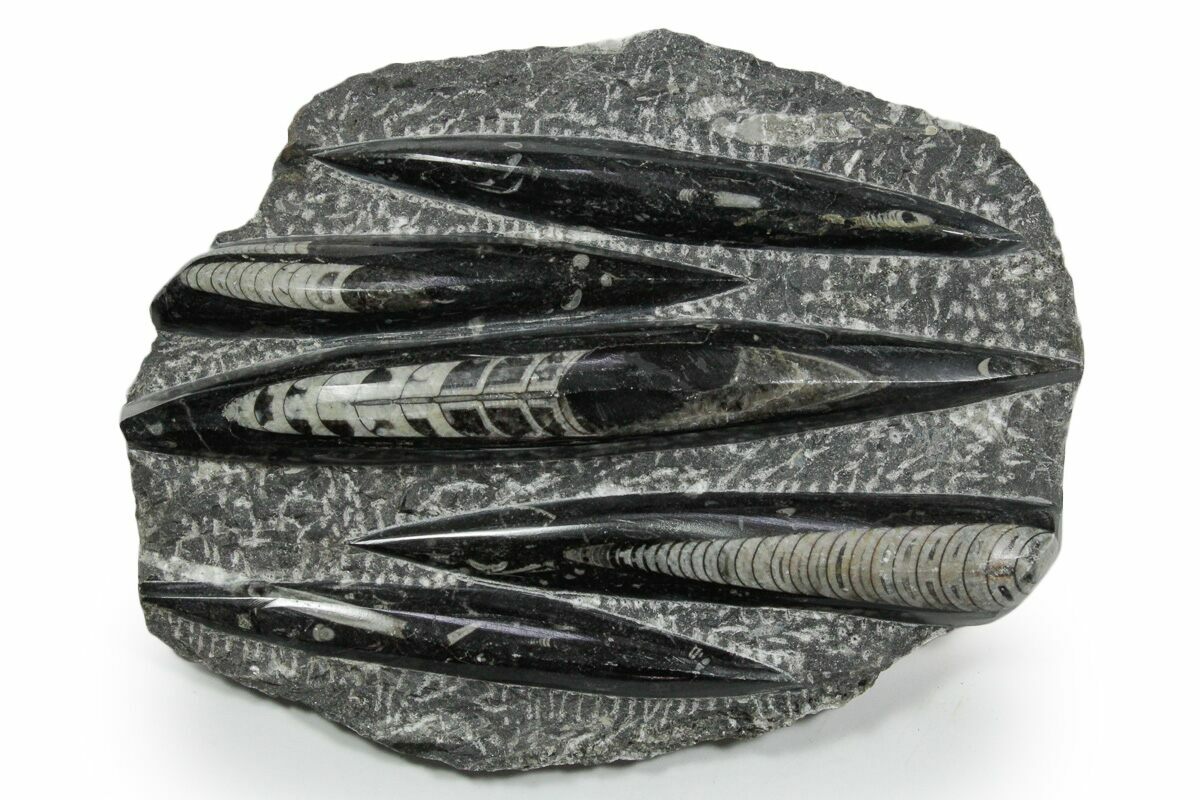 The fossils commonly known as Orthoceras are extinct "straight" cephalopods that lived during the Upper Devonian period around 370 million years ago. Like other cephalopods, they lived inside of their shells, had tentacles they could use to grab food, and used jet propulsion, squirting water to move. The rock containing them is quarried from the Atlas Mountains of Morocco and frequently polished to reveal the fossils and make decorative items with them.