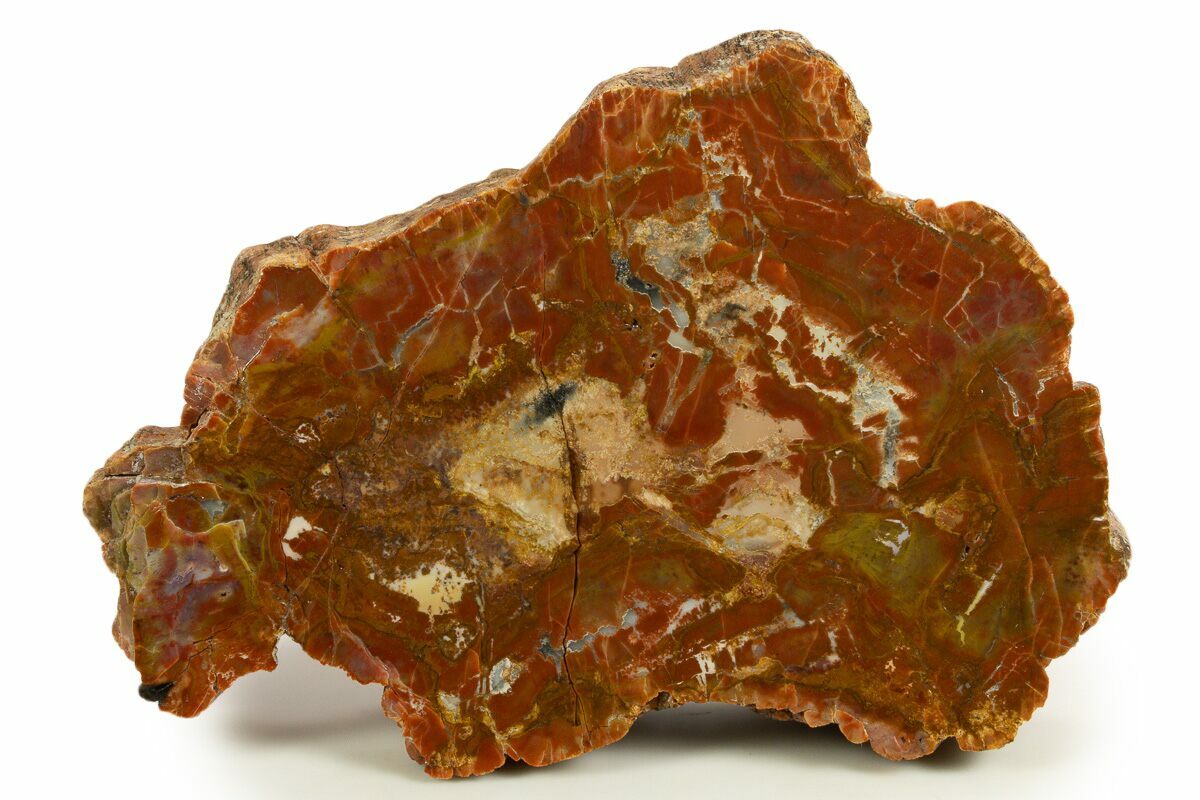 This is a brilliantly colored, 9.2" wide section of petrified wood (Araucarioxylon) from Arizona. One side of the petrified has been polished to a glossy finish, while the exterior surface has a natural texture.