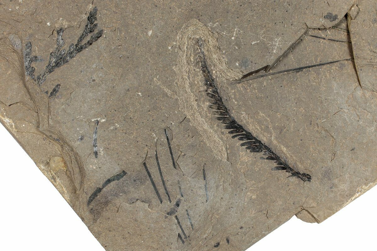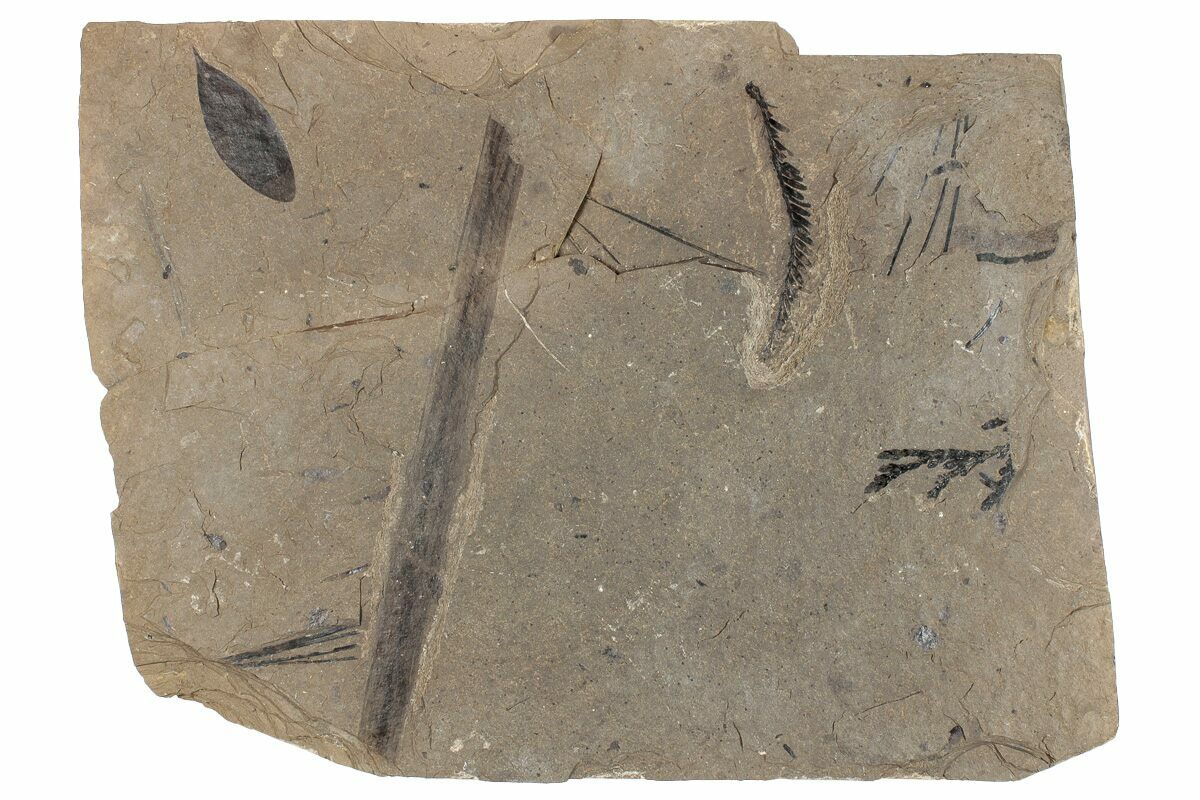 This is a 6.4" fossil leaf plate from the McAbee fossil beds of British Columbia, Canada. It contains a detailed branchlet of Metasequoia sp. needles (2.65" long) on one side together with a larger branch impression, a branchlet of a Cupressaceae species, various partial Pinus sp. needles, and a small unidentified deciduous leaf. The opposite side has many partial Metasequoia and other various conifer fragments. These well-preserved leaves show incredible detail.