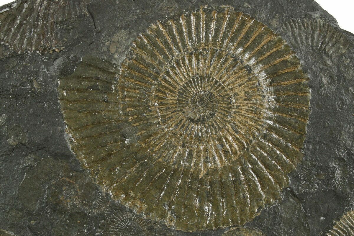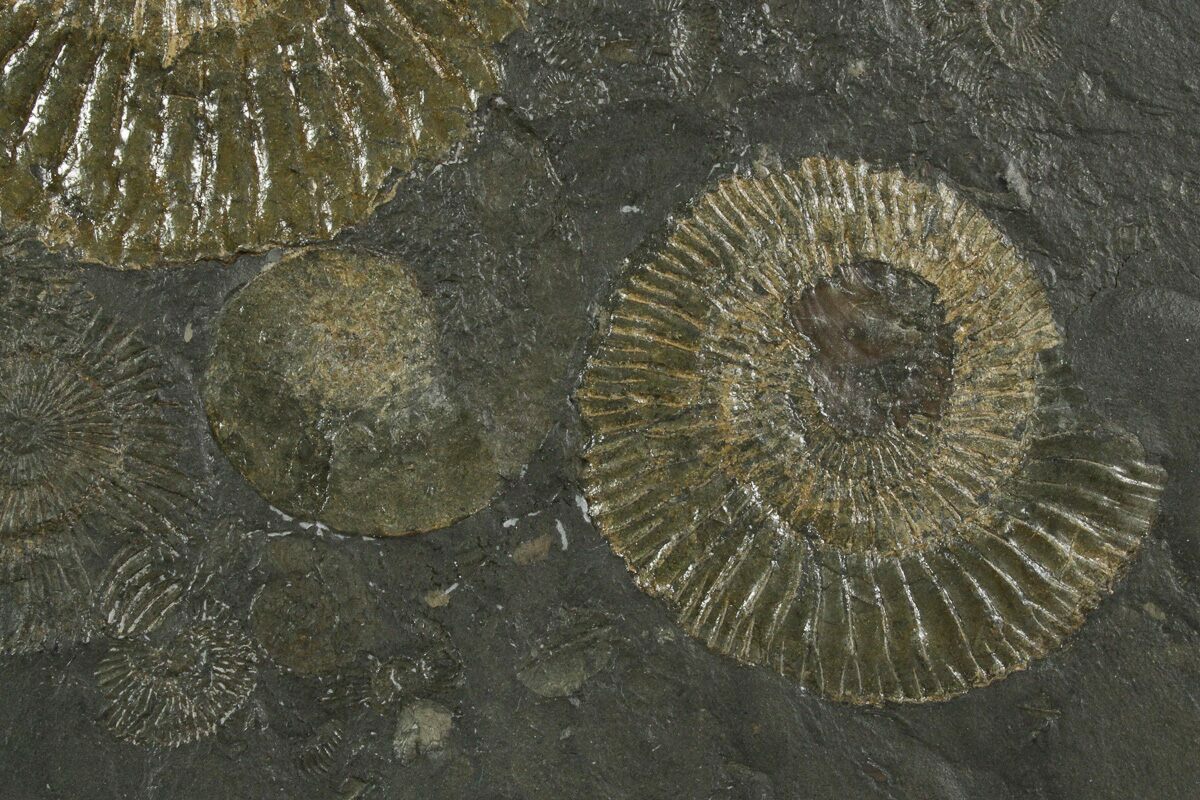 This is a fascinating 9.4" wide cluster of Dactylioceras ammonites from the Posidonia Shale of Germany. These early Jurassic ammonites were naturally compressed within the shale and preserved on sleek, black slate, with patches of fine pyritization highlighting their ribbed shells.